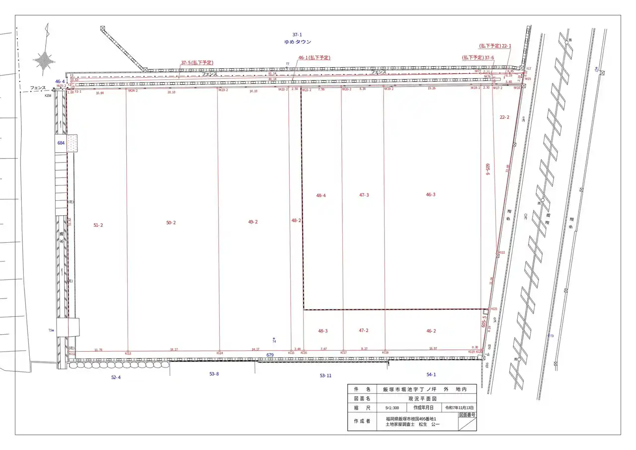 対象地の形状・境界および接道状況を示した地積測量図 |