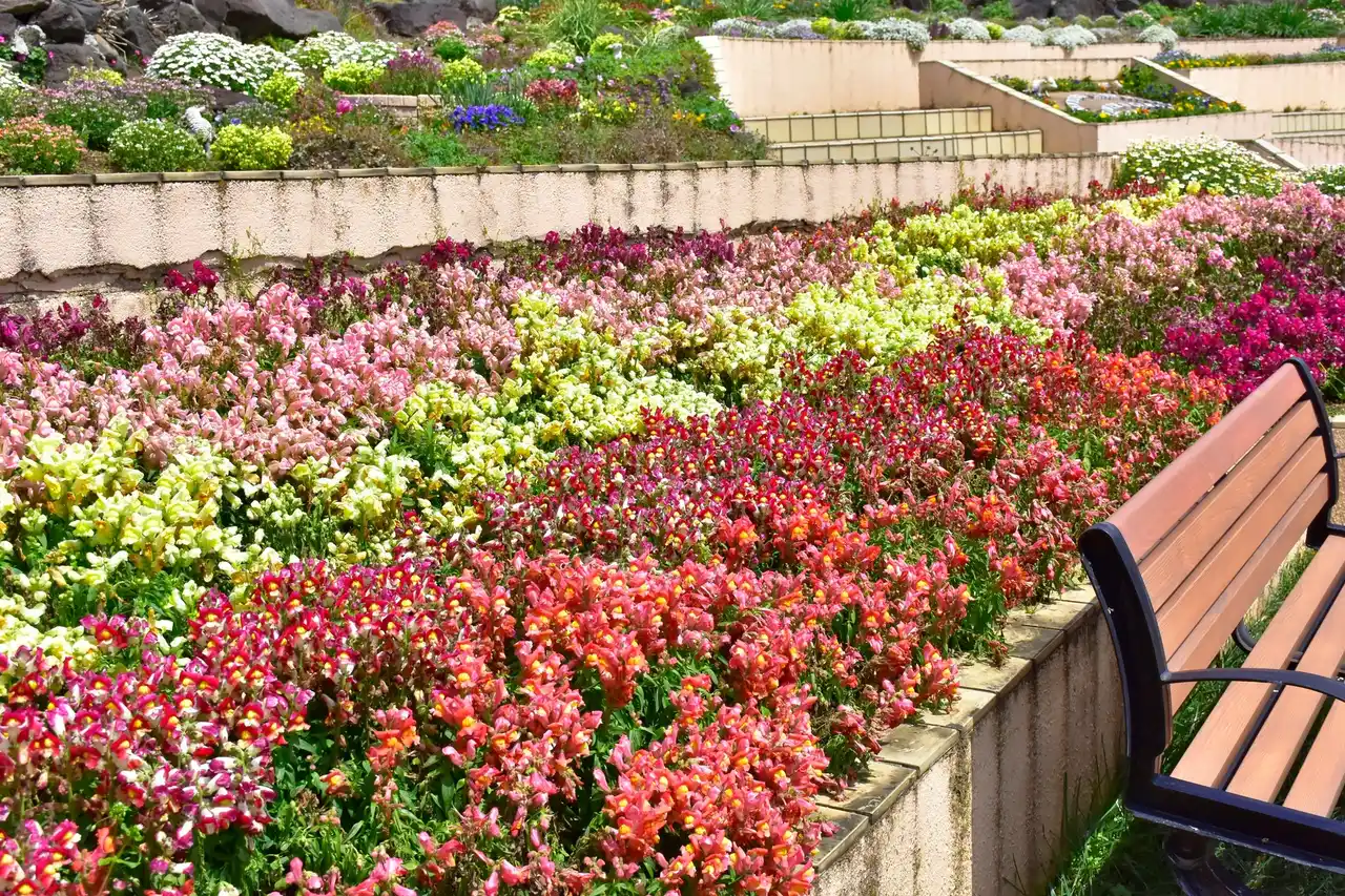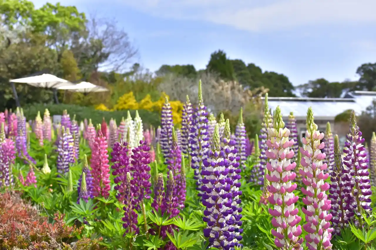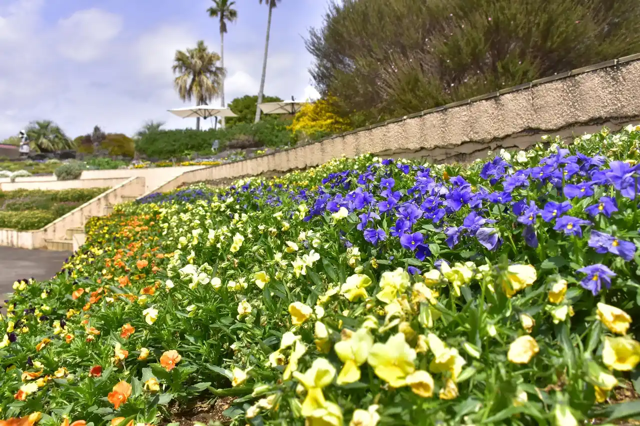 岬の花畑以外にもフラワーシーズンを迎えたガーデンでは、エントランス付近の花壇にルピナスが、階段状の花壇にはネメシア、ビオラ、キンギョソウなど様々な種類の花が咲き、春ならではの光景をご覧いただくことができます。今後はゴールデンウィーク頃まで、花々はより成長して園内各所をカラフルに彩り、真っ白なノースポールや、オステオスペルマム、ガザニア、マーガレットなど次々と見頃を迎え、より一層フラワーガーデンが華やぎます。 |