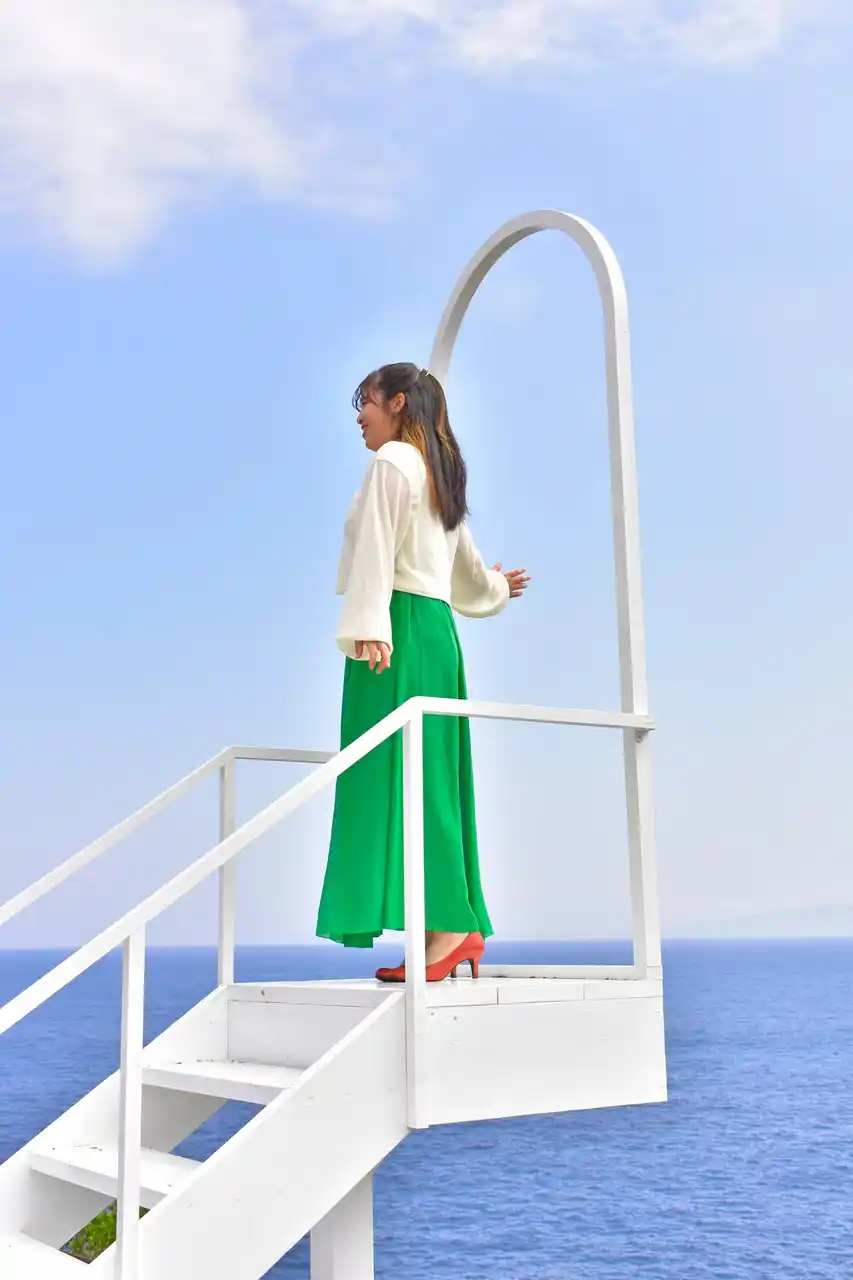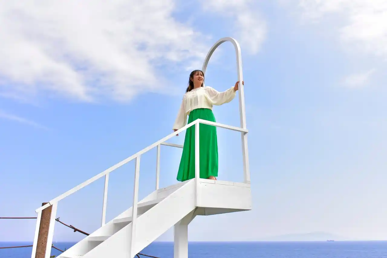 新たに登場したフォトスポットの一つは「Lumiere Ocean Gate ―海へ続く光の扉―」と名付けられた階段で、青い海を背景に空へと延びる白いステップが美しく映え、宙に浮かぶかのようなフォトジェニックな写真を撮ることができます。 |