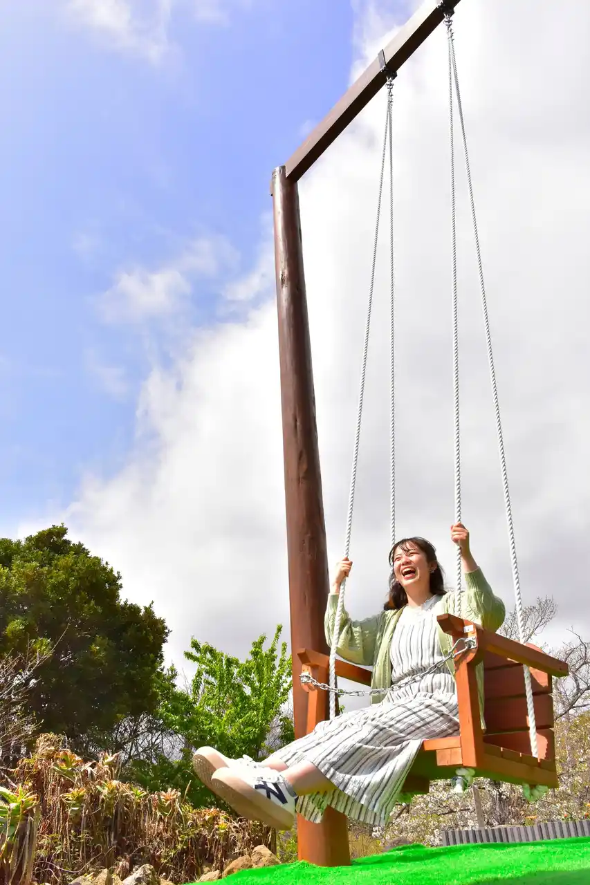 岬の花畑の先にそびえる高さ5mの巨大なブランコが登場!伊豆大島を望む絶景のオーシャンビューと、大空に向かってこぎ出す爽快感。春の陽ざしに煌めく海の美しさも楽しんで♪ |