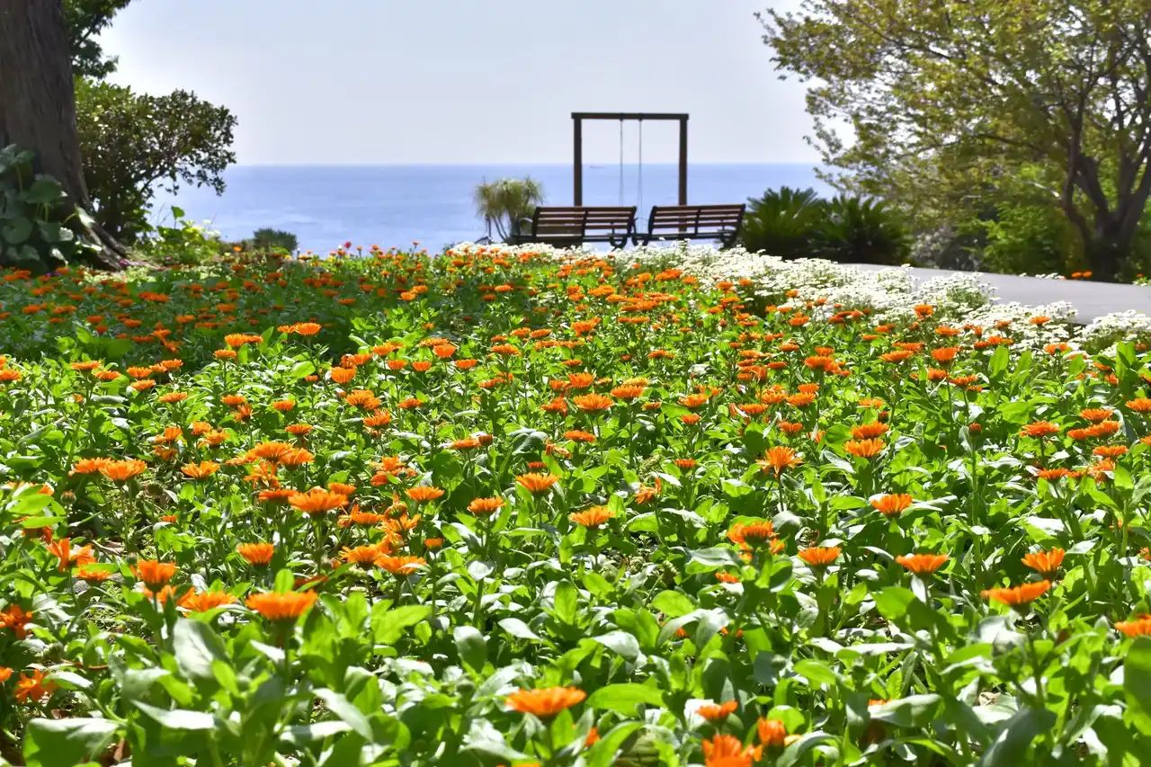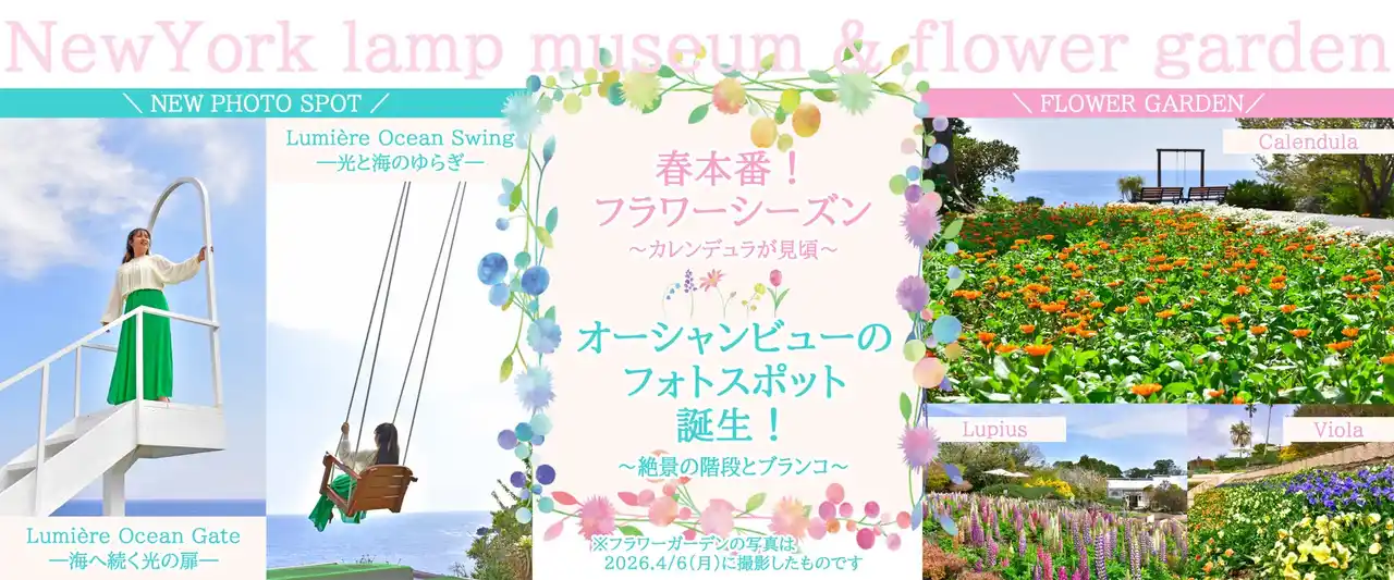 ニューヨークランプミュージアム&フラワーガーデンでは、オーシャンビューの岬付近に植栽した約2,500株のカレンデュラ(キンセンカ)が見頃を迎え、一面を鮮やかなオレンジ色に彩っています。そしてこの春、カレンデュラが咲き揃う岬の先端付近に、圧倒的な美しさとスリルを誇る2つのフォトスポットが誕生いたしました。 |