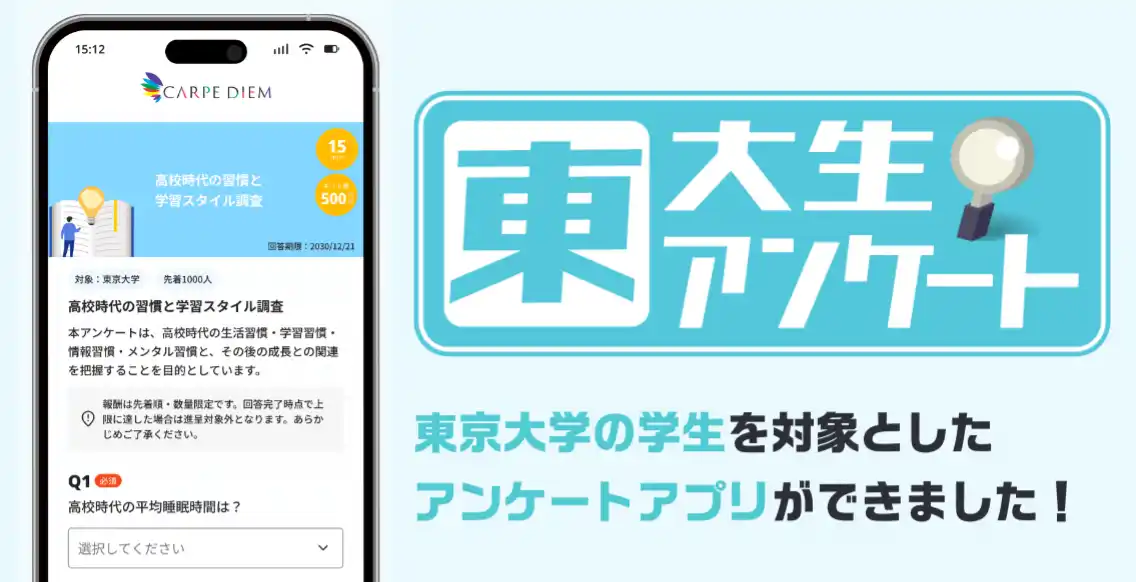 現役東大生を中心に教育支援事業等を行う株式会社カルペ・ディエム(代表者:西岡壱誠 所在地:東京都中央区)は、現役東大生を対象とした独自のアンケートアプリを開発しました。 2026年4月1日のリリースからわずか5日間で、2026年度入学者を含む現役東京大学生100人のダウンロードを達成しており、今年度中に1,000人以上の規模を目指します。 本アプリは、東大生の学習習慣、生活実態、AI活用実態、進路意識などを多角的に可視化し、教育支援や企業マーケティングに還元する「東大生シンクタンク」の基盤となります。 東大生の“個人の経験”を、社会に役立つ“集合知”へ。カルペ・ディエムは、データと教育知を掛け合わせた新たな価値創出に挑戦してまいります。 |