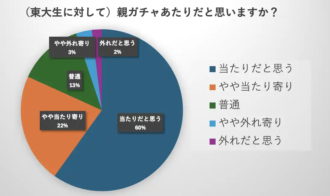 | たとえば、東大生が「親ガチャ当たりだと思う」と答えた人の割合は60.1%であることがわかりました。 | ||||||||||