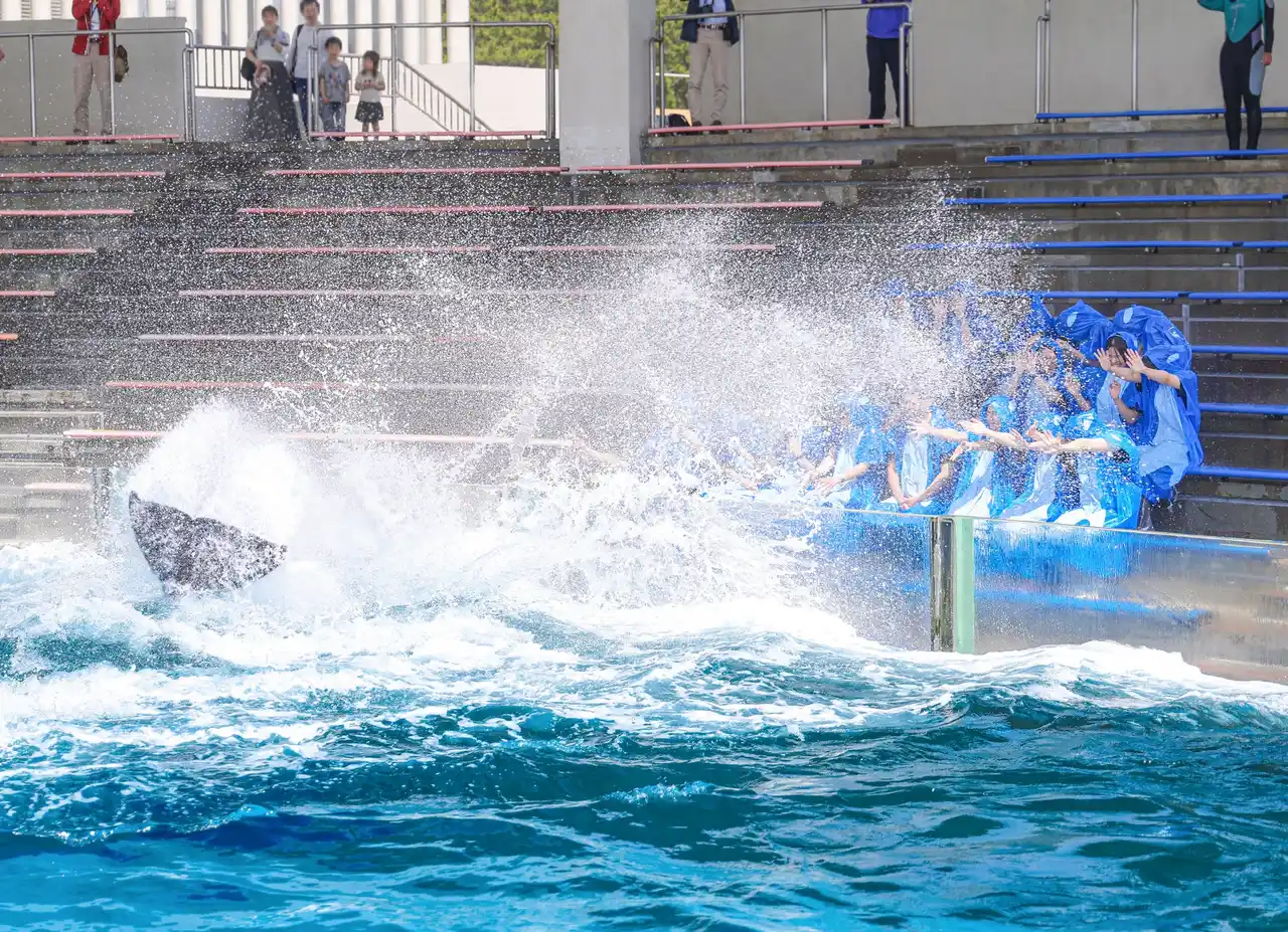 日本屈指の“激しさ”を誇る当館恒例の入社式は、この春で9回目を迎えました。今年度も新入社員への歓迎の意を込めて、鴨川シーワールドの大先輩ともいえるシャチの「ララ」(25歳、体長5.5m、体重2.28t)から祝福の「テールバースト」が贈られました。大人の身の丈に迫る巨大な尾ビレから放たれた豪快な水しぶきは、入社式ならではの緊張感を一気に吹き飛ばし、会場は驚きの歓声と晴れやかな笑顔に包まれました。 |