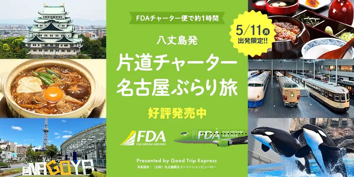 日本空輸株式会社(本社:東京都港区 代表取締役:岡下 敏也/おかした としや)が運営するグッドトリップエクスプレス(グットリ)は、フジドリームエアラインズ(FDA)の片道チャーター便で行く『八丈島発-名古屋ぶらり旅』の提供を5月11日限定で提供いたします。 |