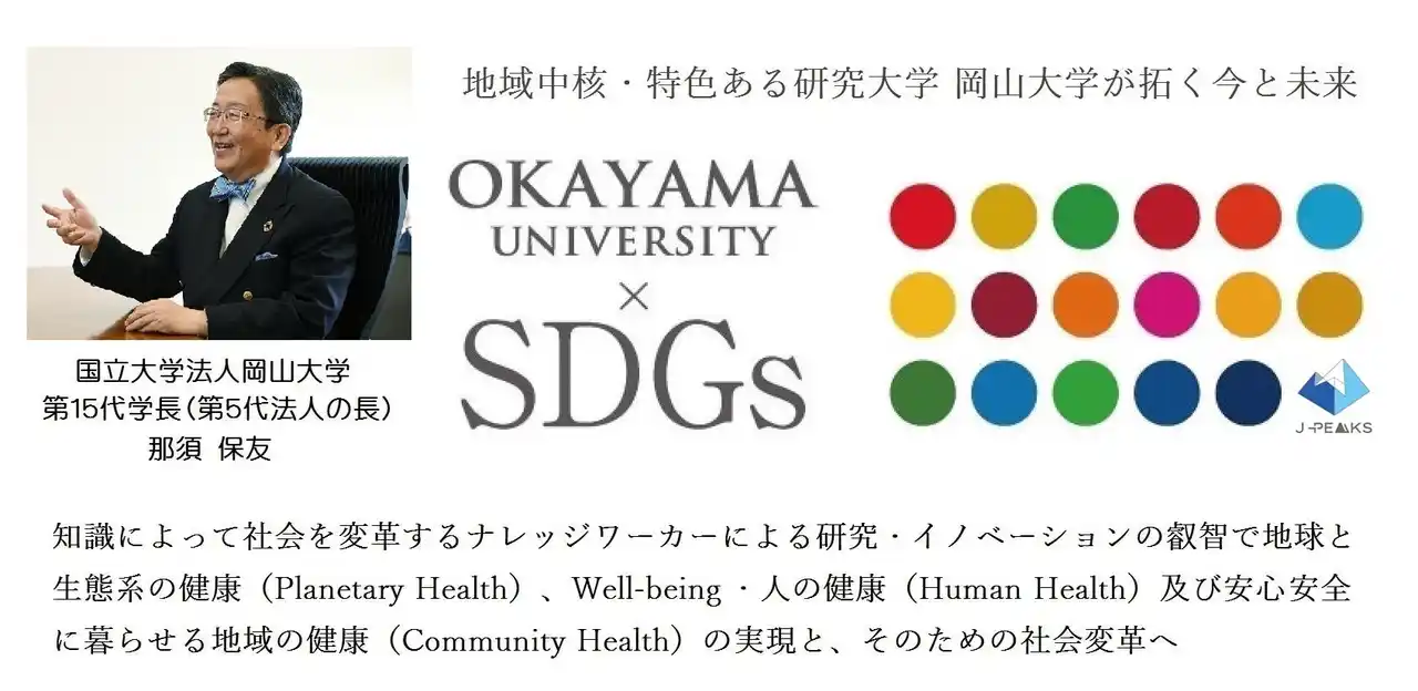 | 国立大学法人岡山大学は、国連の「持続可能な開発目標(SDGs)」を支援しています。また、政府の第1回「ジャパンSDGsアワード」特別賞を受賞しています。地域中核・特色ある研究大学として共育共創を進める岡山大学にご期待ください | ||||