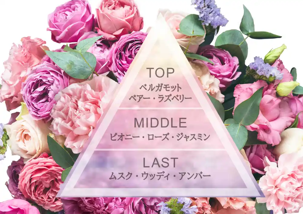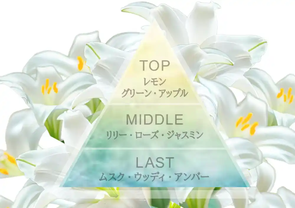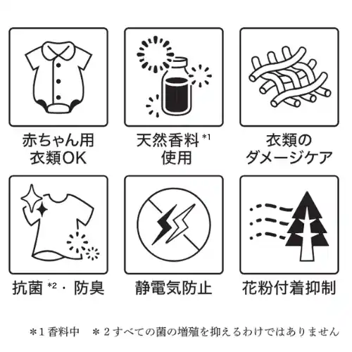 独自処方のヒアルロン酸柔軟成分*²を配合し、繊維へ密着&奥までとどきやすく*⁴した独自のブレンド。衣類の柔軟性・肌触り向上、ダメージケア、肌と衣類のこすれによるチクチク感を軽減、さらに赤ちゃんの衣類にもご使用いただけます。また上質な香りを楽しめるよう、天然香料*⁵を一部使用し、まるで香水のような上品な香りに包まれます。 |