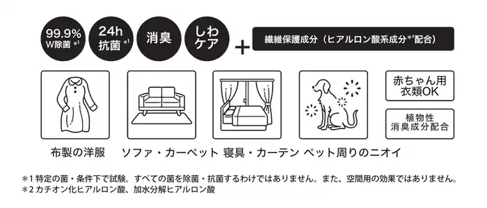 さらにファブリックミストとしての機能として「24h抗菌*⁸」・「消臭」・「しわケア」 |
