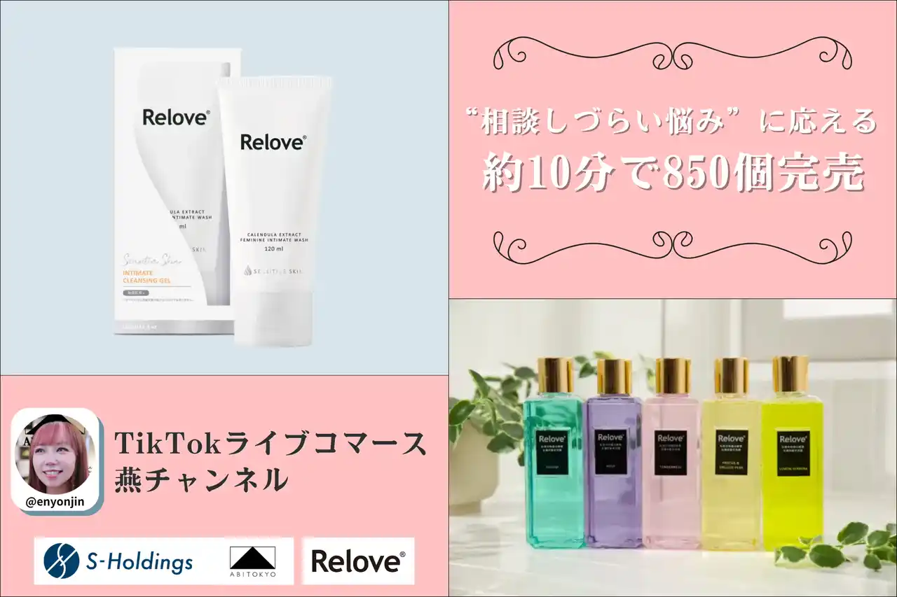 ライブコマース事業、ブランド事業、AI事業などを展開し、日常と未来を彩る最高の体験を創造する株式会社Sホールディングス(本社:東京都品川区、代表取締役CEO: 燕 咏靖)は、当社運営のアパレルブランドABITOKYOが企画・配信するTikTokライブコマース「燕チャンネル」において、2026年3月17日(火)、日本初上陸となる台湾発のフェムケアブランド「Relove(リラブ)」のライブ配信を実施しました。本配信では、約10分で約850点を完売し、売上高約400万円を記録。配信開始直後から注文が集中し、短時間で高い販売実績を創出しました。