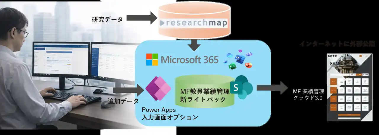株式会社メディアフュージョン(本社:大阪市北区)は、2025年に大規模ユーザの大学や研究所に対応したMF教員業績管理システム「新ライトパック」をリリースしました。2026年4月1日、本システムの追加オプションとして、researchmapに登録できないデータをPower Appsの追加入力画面で登録できる「Power