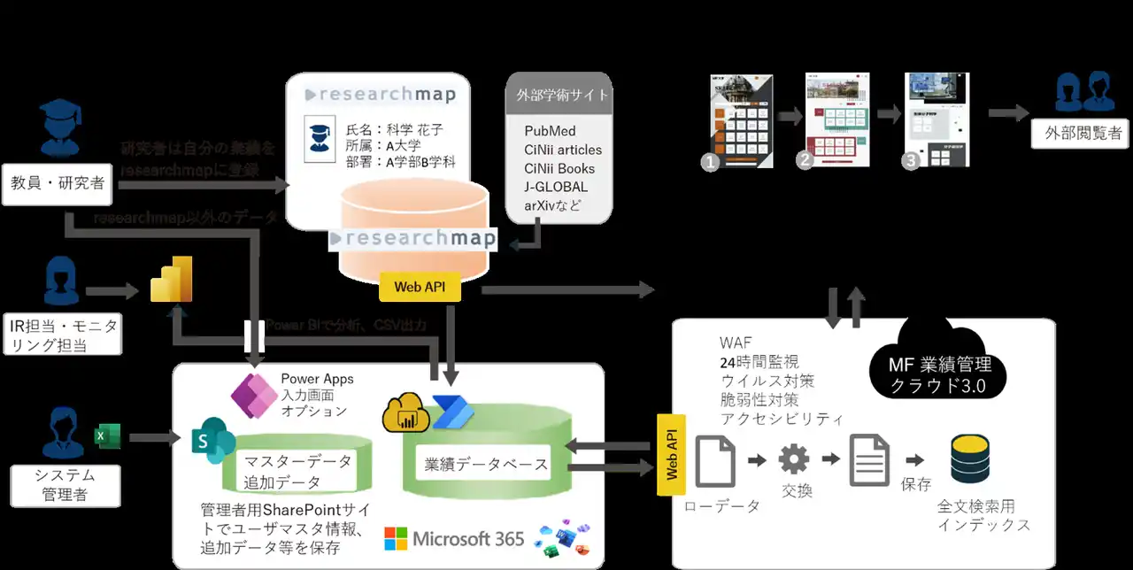 ハイブリッド構成による安全な外部公開:登録した業績の外部公開機能に関しては、Microsoft 365上で実現しようとすると運用費が非常に高額になるため、これは弊社の外部公開クラウドサービス「クラウド3.0」を利用します。 |