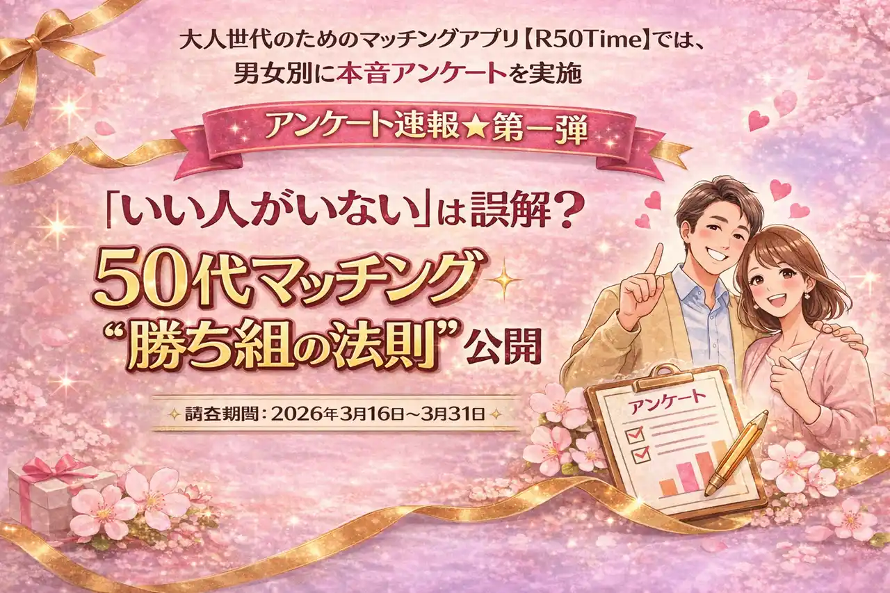 『R50Time』は、40代・50代・60代以上の大人世代を中心に、「これからの人生を一緒に楽しめる相手」との出会いを応援するマッチングアプリです。恋愛だけでなく、食事・趣味・会話を楽しめる「縁活」を幅広くサポートしています。 |