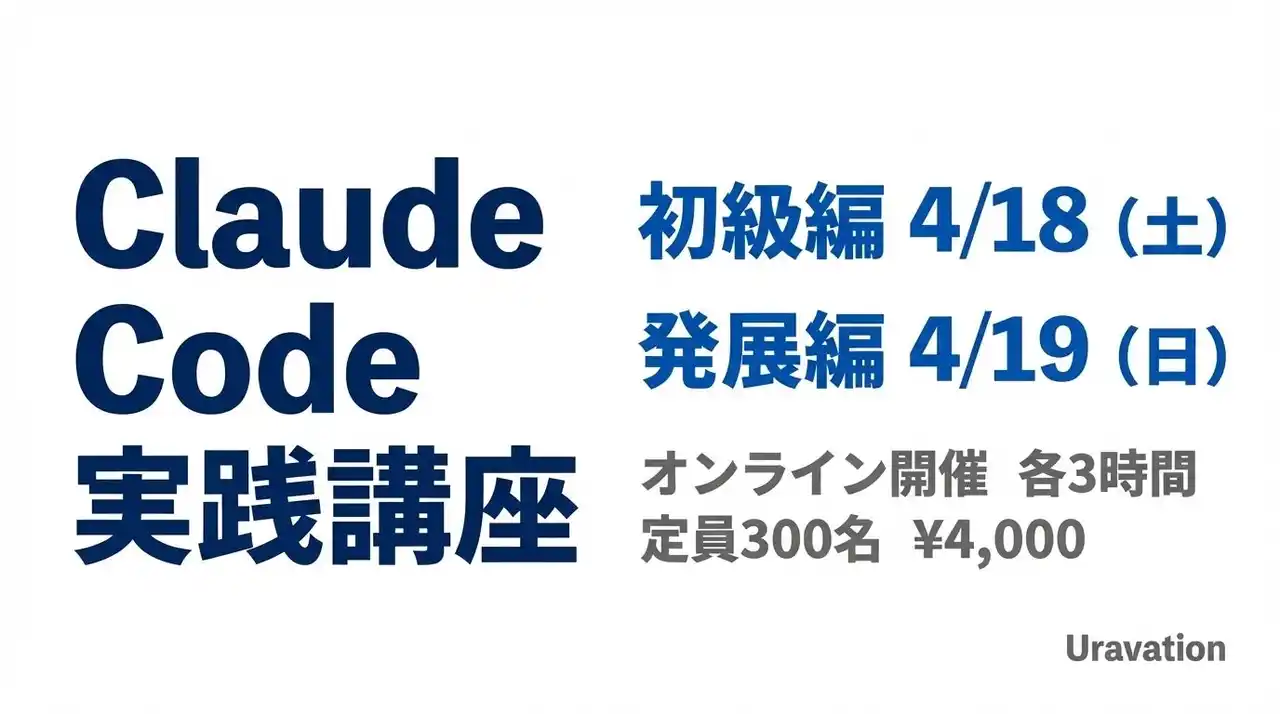 | 株式会社Uravation(本社:東京都文京区、代表取締役:佐藤 傑)は、AI開発ツール「Claude Code」の実践スキルを3時間で習得できるオンライン講座を2026年4月18日(土)・19日(日)の2日間にわたり開催いたします。 | |||||||||||||||||||||