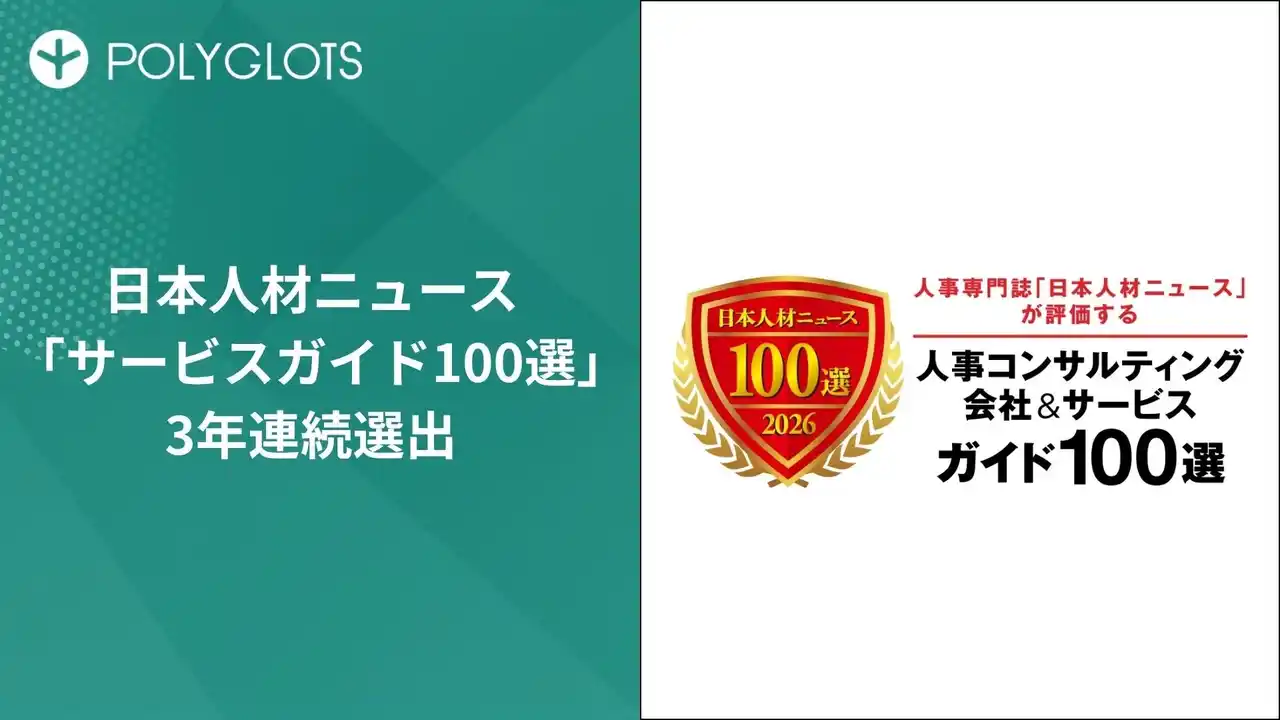 | 株式会社ポリグロッツの「“AI×先生”による個別最適化された英語研修サービス」が、2026年度の日本人材ニュース提供「人材・人事コンサルティング会社&サービスガイド100選」に選出されました。株式会社ポリグロッツは3年連続の選出となります。 | |||