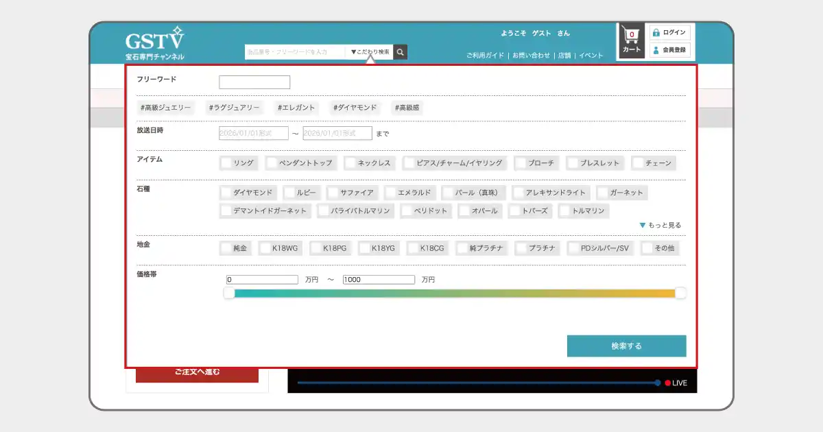 検索窓の横に、複数の条件で商品を絞り込める「こだわり検索」機能を実装しました。宝石専門チャンネル『ジュエリー☆GSTV』と連動した「放送日時」をはじめ、さまざまな項目を組み合わせて検索できるため、ユーザーが希望に合った商品へスムースにたどり着けます。 |