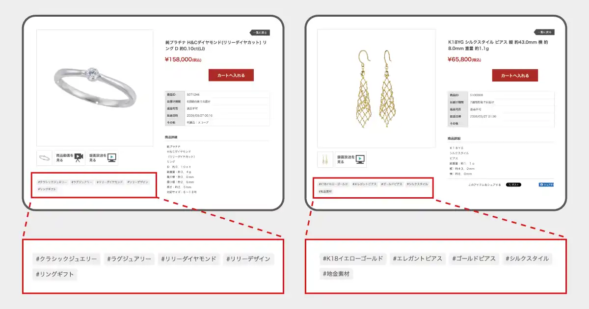ハッシュタグ例:「#日常使い」「#差し色ジュエリー」 |