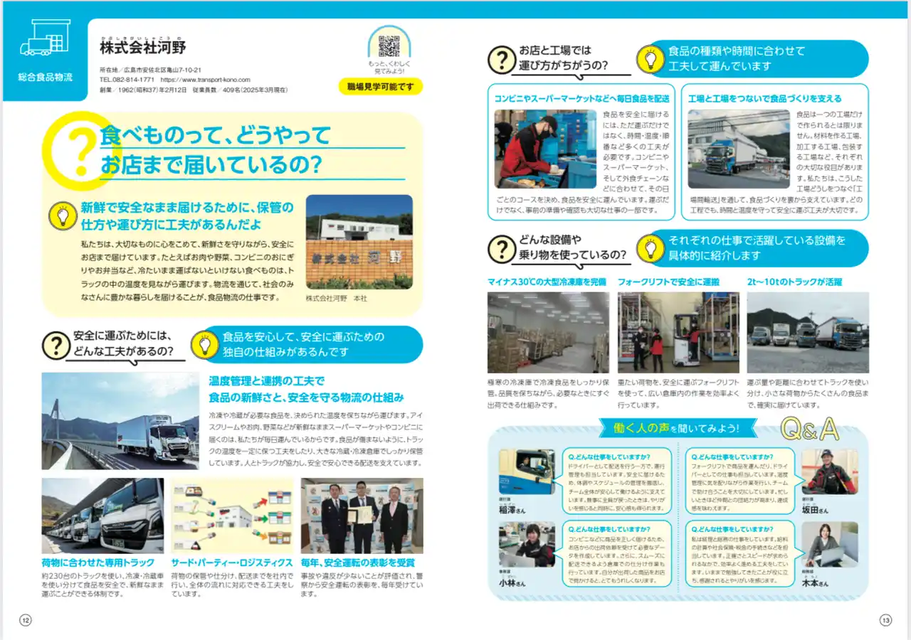 広島県を拠点に食品物流サービスを展開する株式会社河野(本社:広島県広島市、代表取締役:河野幹章 https://www.transport-kono.com/)は、文部科学省が推進するキャリア教育のための副教材2026年度版「小学生のためのお仕事ノート広島市2026年度版」、「中学生のためのお仕事ブック広島市2026年度版」に協賛しましたことをお知らせします。 |