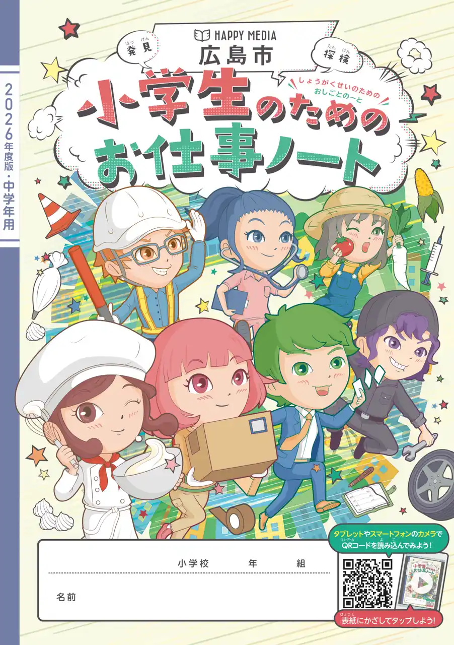 「お仕事ノート」・「お仕事ブック」は、株式会社中広が企画・発行するキャリア教育副教材です。仕事の流れや実際に働く人の声が分かりやすく紹介されているほか、誌面にはQRコードも掲載されており、タブレットやスマートフォンからホームページへアクセスできるなど、子どもたちが楽しみながら学べる工夫が施されています。 |