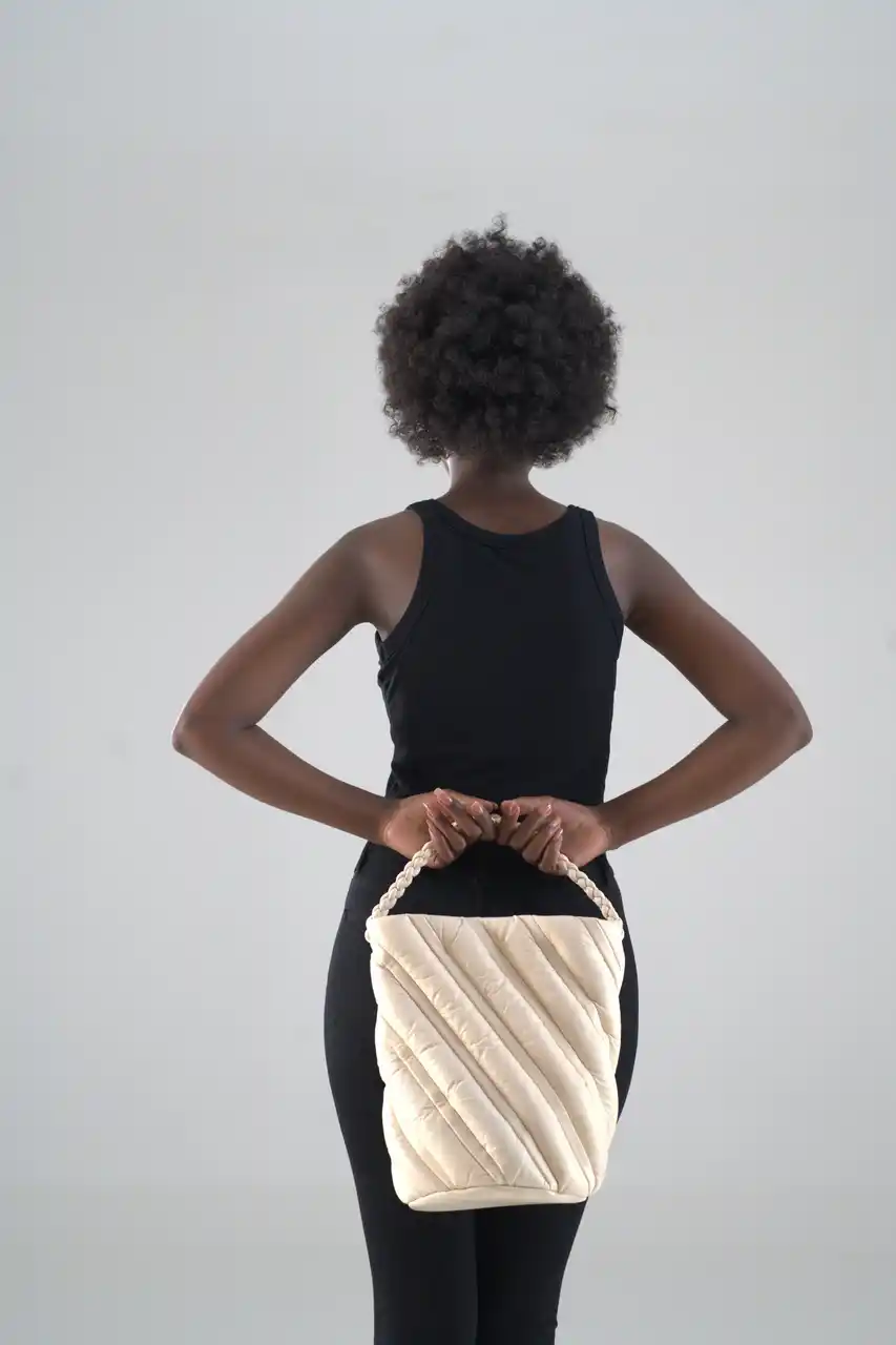 Tiras:エチオピアの木製枕Tirasに着想を得て生まれたトートバッグ。ライニングには、エチオピアのフェアトレードブランド、サバハールの手織布地を採用。Tiras S H17×W16-30×D10(cm) 74,800円 / Tiras L H27×W20-38×D10(cm) 85,800円 |