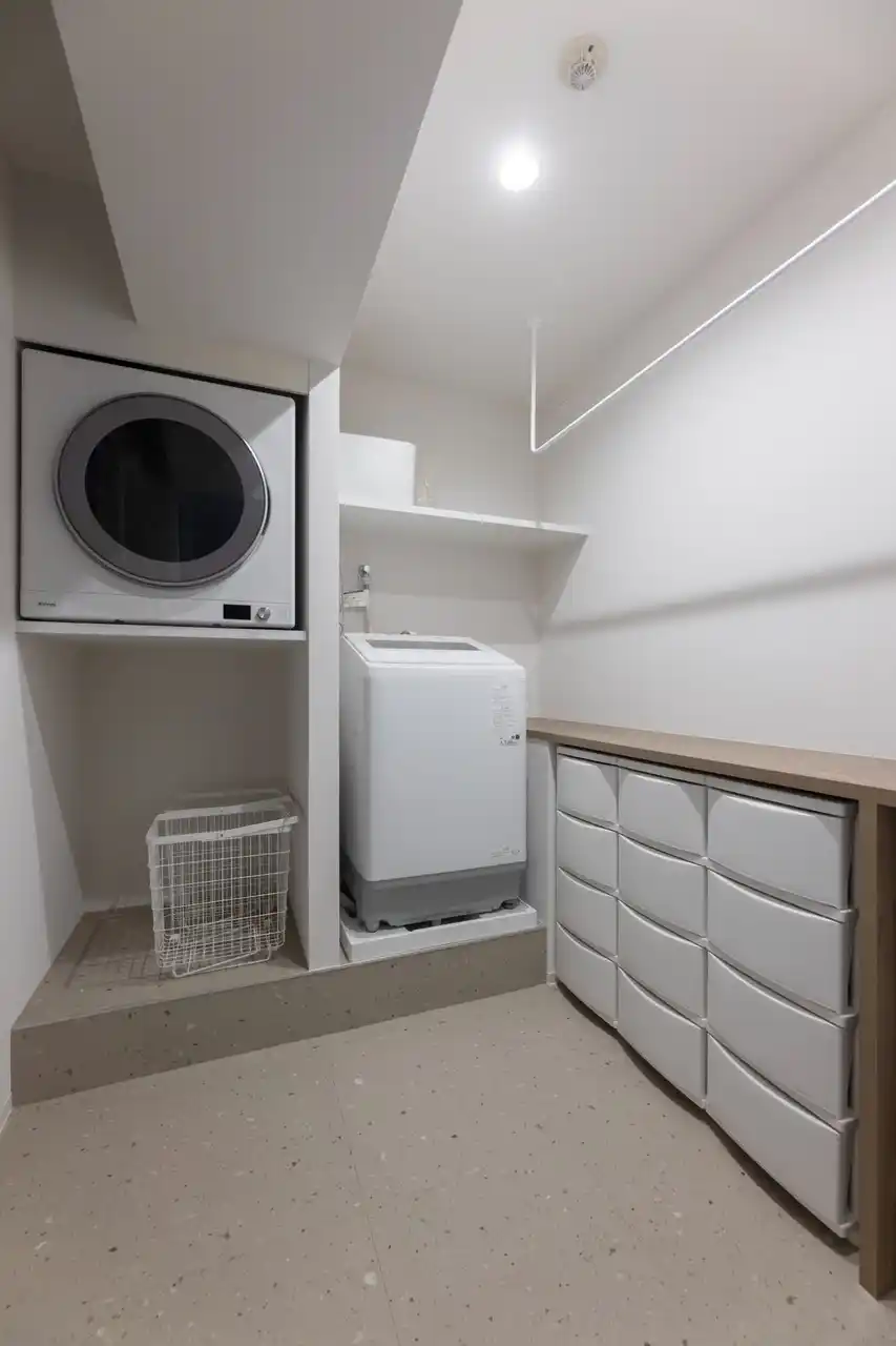 ランドリールームには室内干し用のパイプや可動棚を配置し、洗濯~収納までをひとつの場所で完結。家事が効率よく行えるだけでなく、日常の動きがスムーズになり、暮らしの快適さを格段にアップさせています。 |
