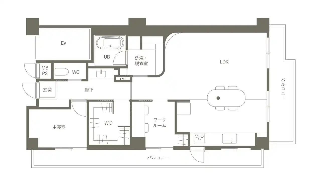 完全オーダーメイドのキッチンは、レンジフードや家電を収納の中にすっきり収める設計。壁付けにすることでLDKの視線が抜け、空間が広く感じられます。さらに家具のように馴染むデザインで、生活感を抑えたミニマルな印象を実現しています。 |