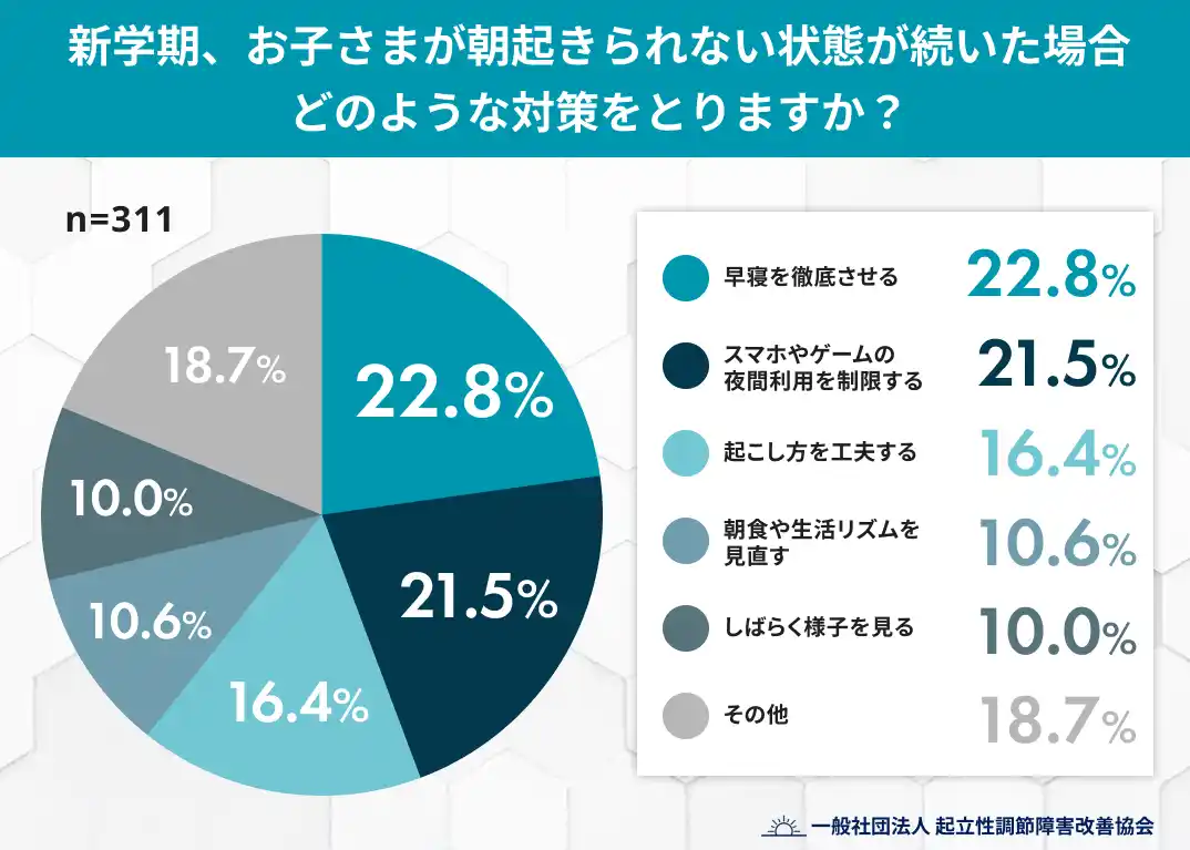 今回の調査により、新年度に向けて保護者の約3割が不安を抱え、約7割の子どもが日常的な起きづらさを感じている現状が示されました。対策は「早寝」「スマホ制限」等の生活習慣の調整に集中しており、医療機関への相談を検討する層は1.9%と極めて少数です。疾患としての認知と対策に乖離がある現状を受け、不調を「疲れ」で見過ごさず、専門的な視点を含めた多角的なサポート体制の構築が求められます。 |