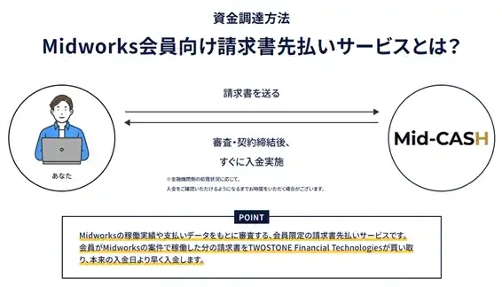 | 「Mid-CASH」は、「Midworks」の会員を対象とした請求書先払いサービスです。報酬請求権を買い取ることで、本来の報酬の入金日を待たずに資金化を可能とし、安定したキャッシュフローの実現を支援します。(※1) | |||