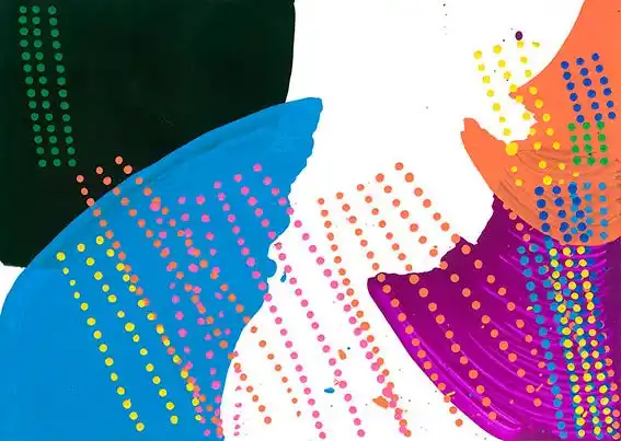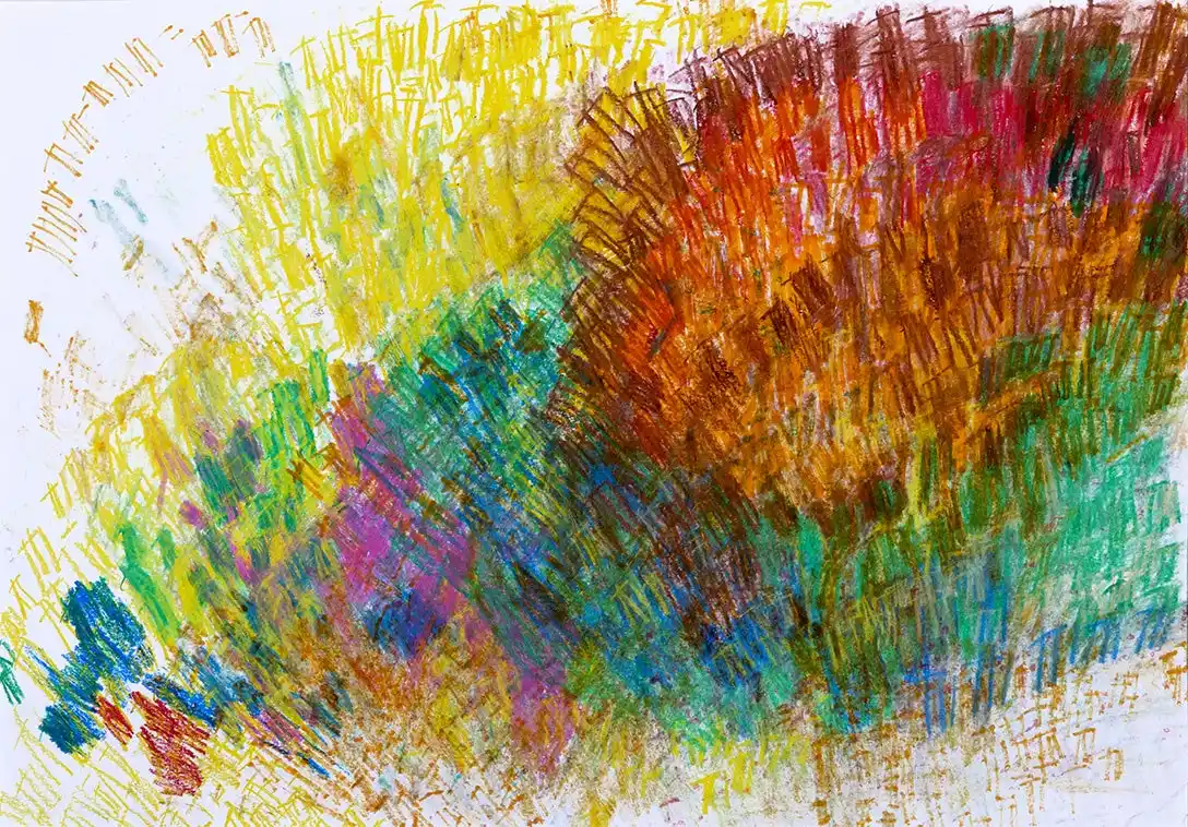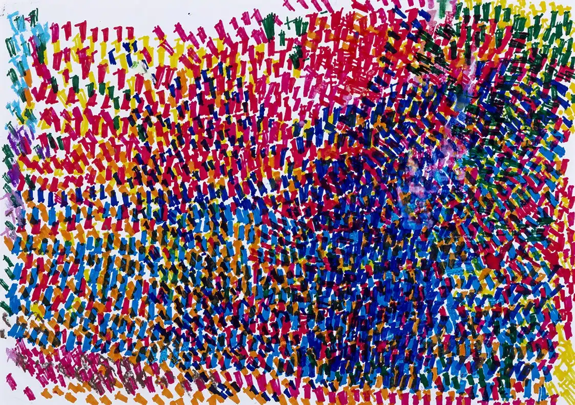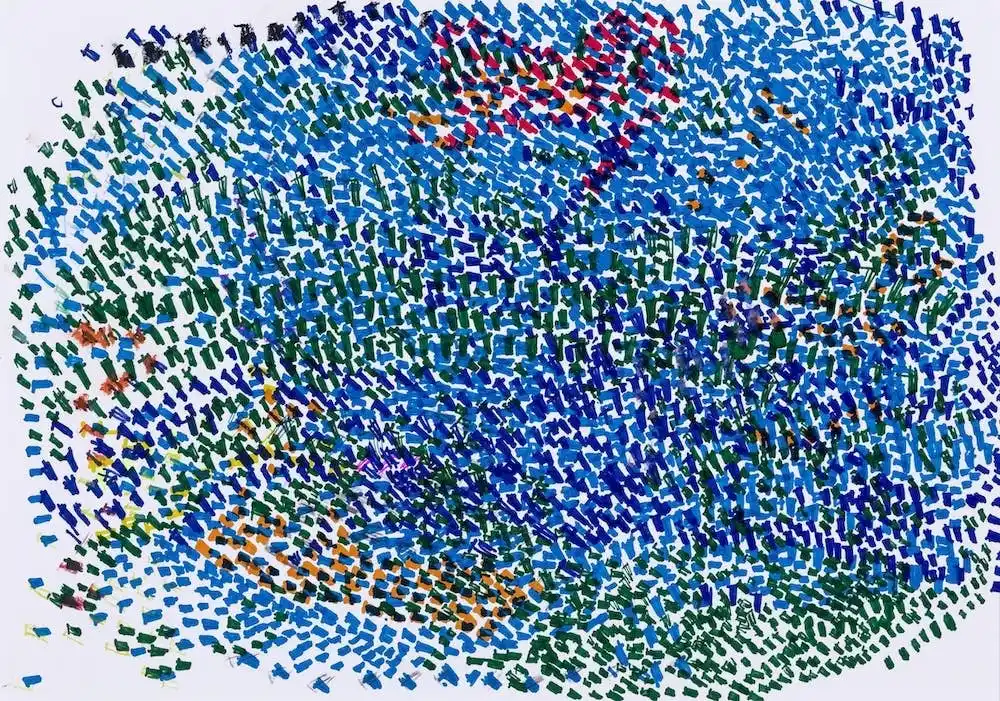 様々な色でいくつも描かれた扇形と点の模様。筆の動きや点の打ち方は規則正しく、同じ動作をゆっくりと繰り返す。気になる事がなく気持ちが穏やかな時ほど、きれいな筆使い、整列された『点』になるよう3列に描かれていく。イメージしているものがあるのか、色や動きを楽しまれているのか、何を感じて描いているのかは彼にしか分からない。 |