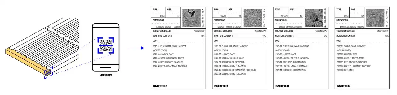 KNOTTERが描くのは、家具が「旅」をすることで、森と都市をゆるやかに結び直し、時間とともに価値が蓄積されていく「共環の社会」です。そのビジョンの実現のため、「旅する家具」の販売、法人利用の事業成長と並行して、木材が持つ唯一無二の木目を個別に認証する技術で、「川上(伐採)」「川中(加工)「川下(流通・消費者)」まで、情報を途切れさせずに木材のトレーサビリティーデータを管理できるのが強みです(実証実験中)。