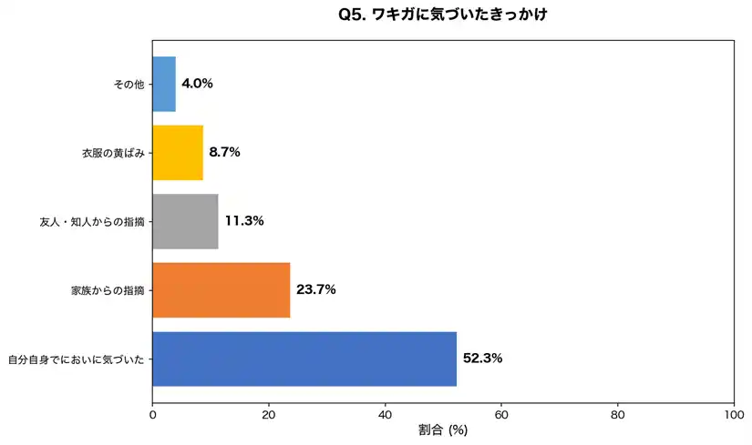 | 52.3%が自分自身でにおいに気づいており、セルフチェックの重要性が示されました。一方で、約35%は他者からの指摘がきっかけとなっており、においの問題は本人が気づきにくいケースも少なくないことがわかります。 | |||||||||||||||||||||||||||