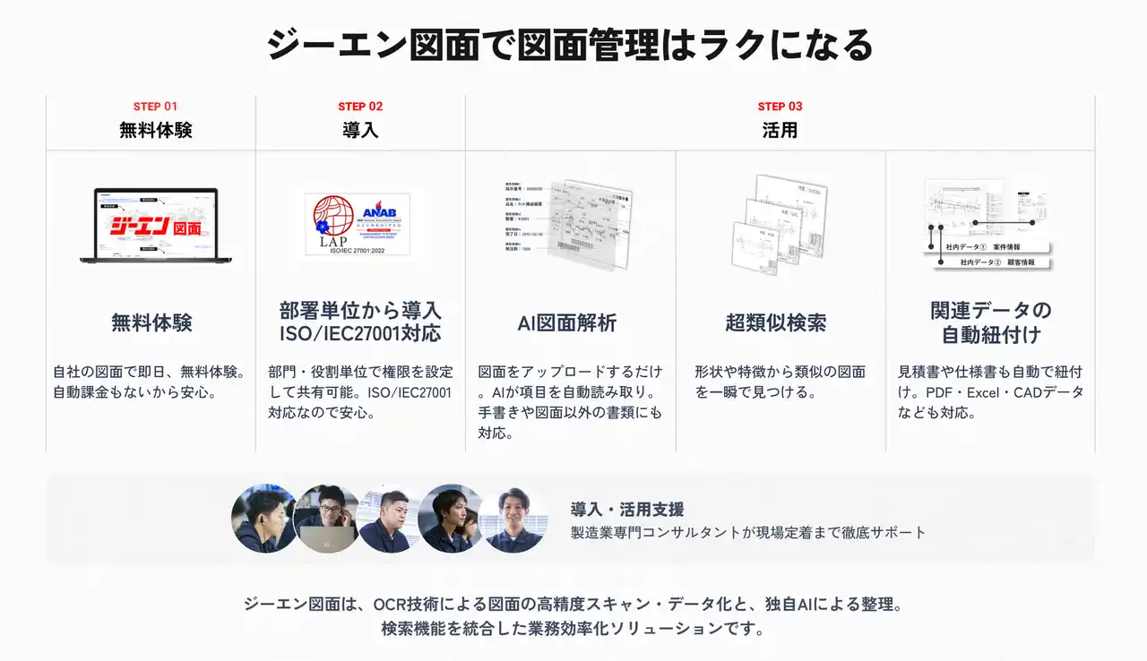 また、ジーエン図面はシステムを導入して終わりではなく、現場で活用され、定着するところまでを重視しています。製造業専門のコンサルタントが伴走し、現場のオペレーションやデータ管理体制に合わせた活用方法を提案するほか、既存データ基盤からの移行支援や利用者向け説明会の実施など、導入後の活用まで支援します。 |