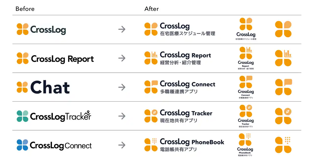 こうした変化を踏まえ、複数のサービスを「在宅医療DX支援サービス」としてより統一感のあるブランドとして整理し、クロスログ全体の価値をより直感的に理解いただけるよう、今回のブランド体系のリニューアルを実施しました。 |