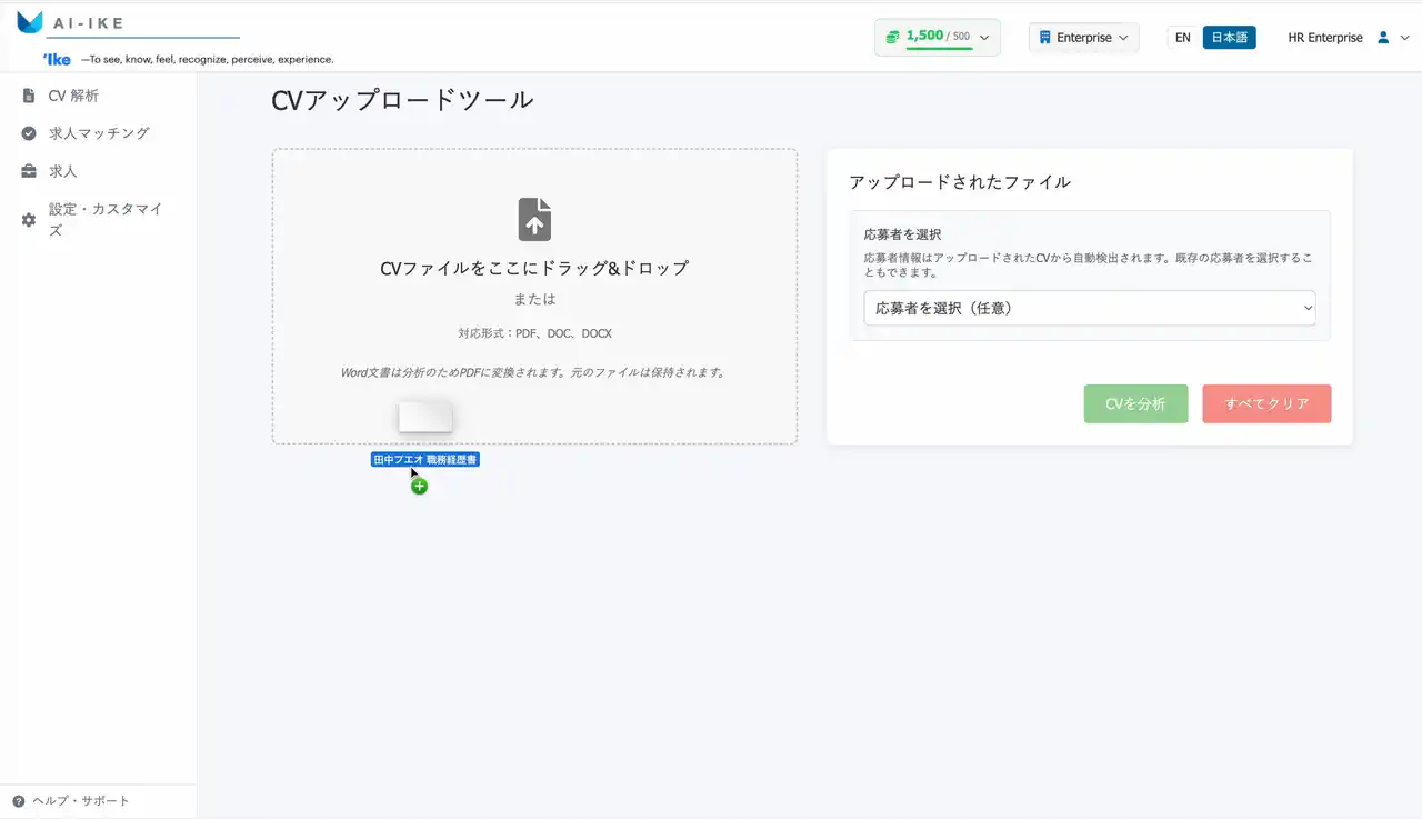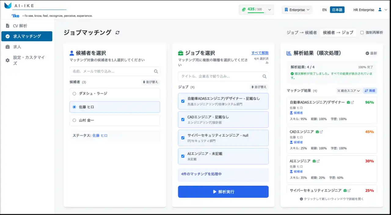 AI-Ike Enterprise内に候補者の情報と募集内容の両方を取り込み、それぞれをシステム内で選択後、解析を実行するだけで、AIが適合性を分析し総合スコア化することが可能です。 |