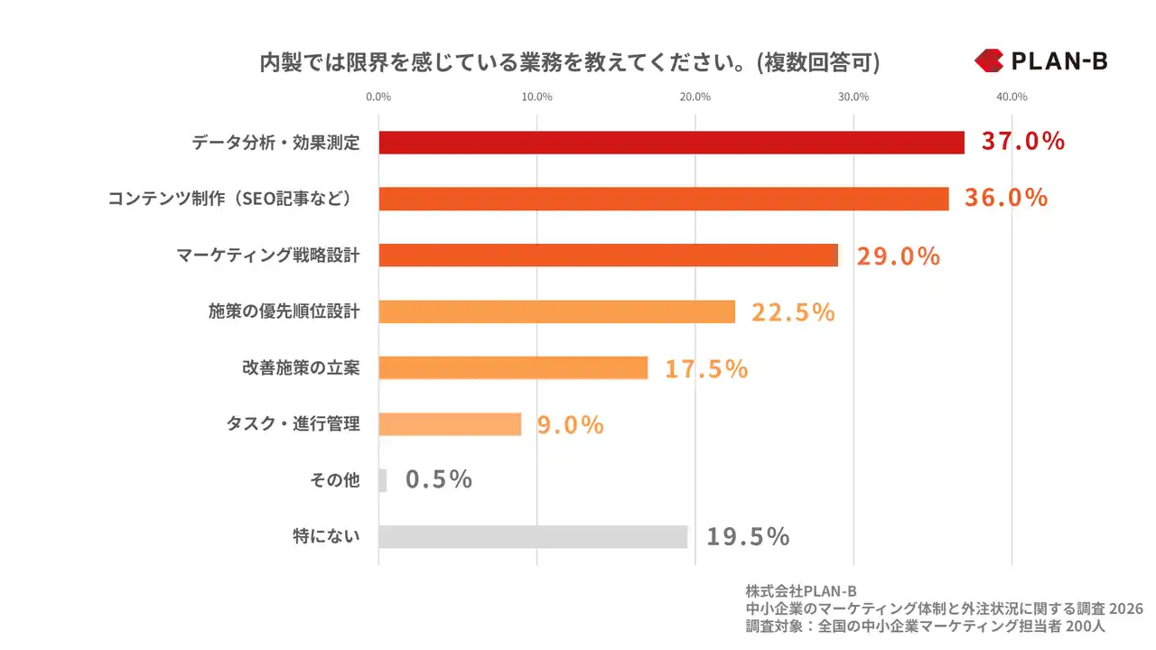 「内製では限界を感じている業務を教えてください。」という質問では、「データ分析・効果測定」が37.0%で最多となりました。 |
