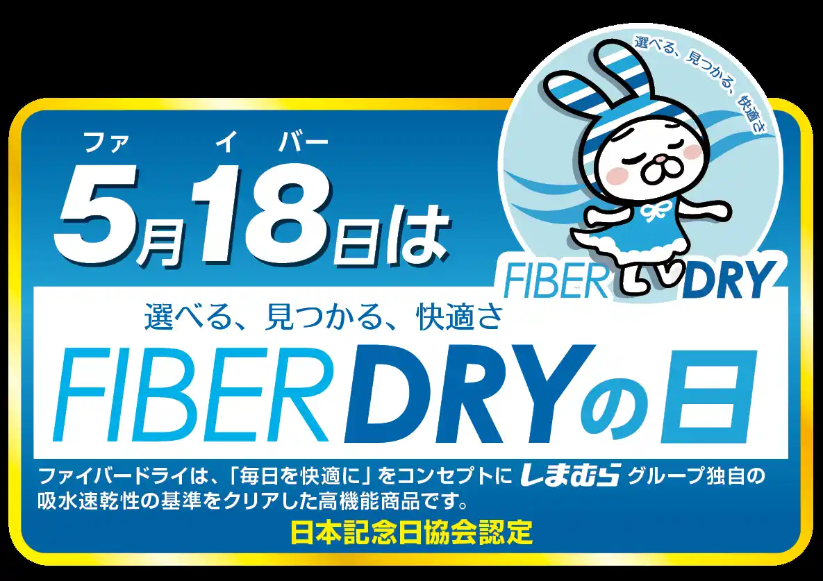 「FIBER DRY」は「選べる、見つかる、快適さ」をキャッチコピーに、しまむらグループが独自に設定した基準をクリアした、着心地の良さにこだわった商品です。 |