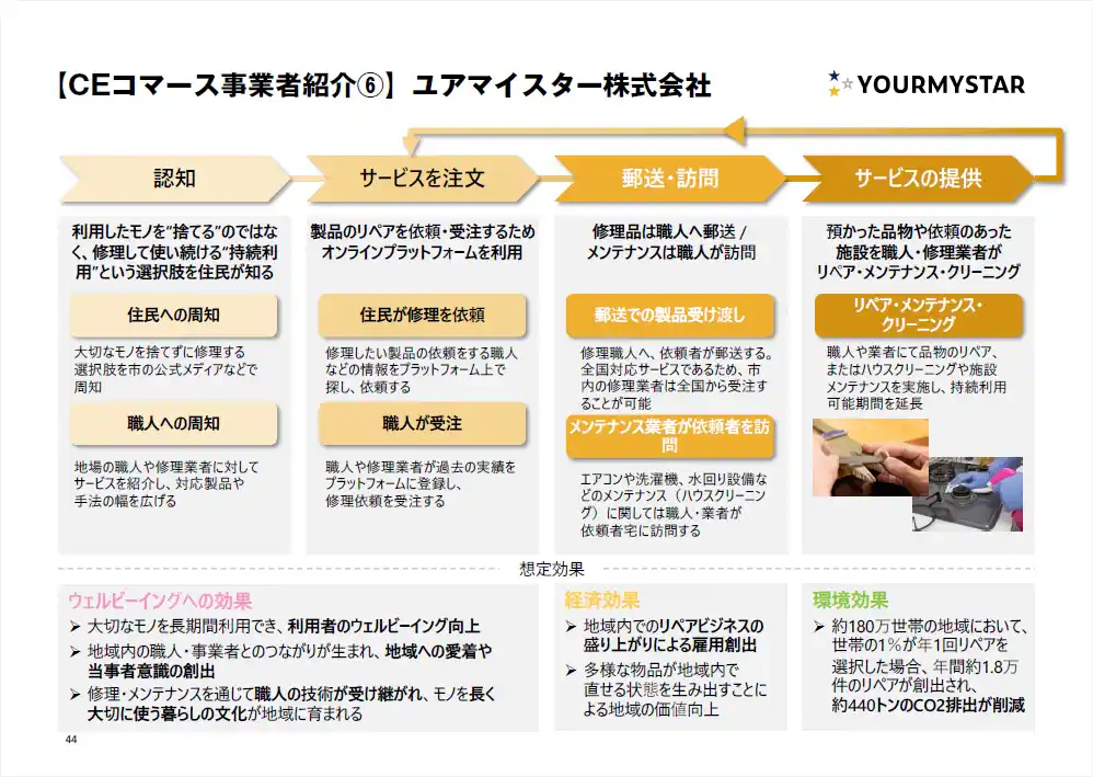 こうした取り組みは、CEコマースが掲げる「物品の寿命を延ばす」という領域に位置づけられるものであり、ユアマイスターは創業以来、この領域におけるサービス提供を一貫して行ってきました。 |