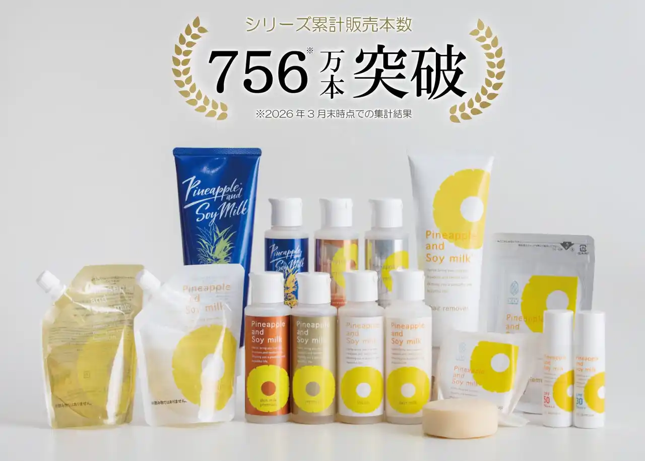 株式会社鈴木ハーブ研究所が研究開発、販売している体毛ケア*²化粧品「パイナップル豆乳シリーズ」は、2004年の発売以来シリーズ累計販売本数756万本*¹を突破いたしました。