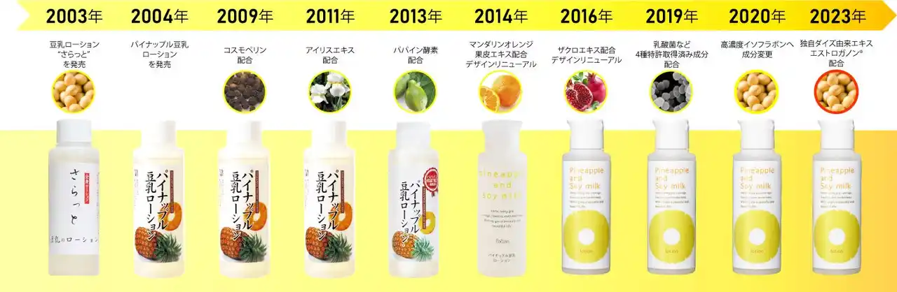 「本当に実感できるもの」を追求した結果、リニューアルを繰り返し、常に進化し続けています。新成分を見つけるたび、安全性や配合バランスを何度も検証し、今お届けできる最良の製品を世に送り出しています。また、パイナップル豆乳シリーズに使用する高純度・高濃度なイソフラボンの抽出技術は、独自の研究開発によるものです。2022年2月には、独自大豆由来成分『エストロガノン(R)』の商標登録が承認されました。 |