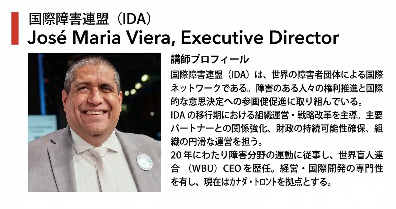 | IDAのエグゼクティブ・ディレクターであるJose Maria Viera氏を招き、2027年に日本で開催が決定した「世界障害者地域サミット(Global Disability Summit アジア地域版)」を見据えた国際的潮流と、企業・福祉・市民社会が果たすべき役割について議論します。 | |||