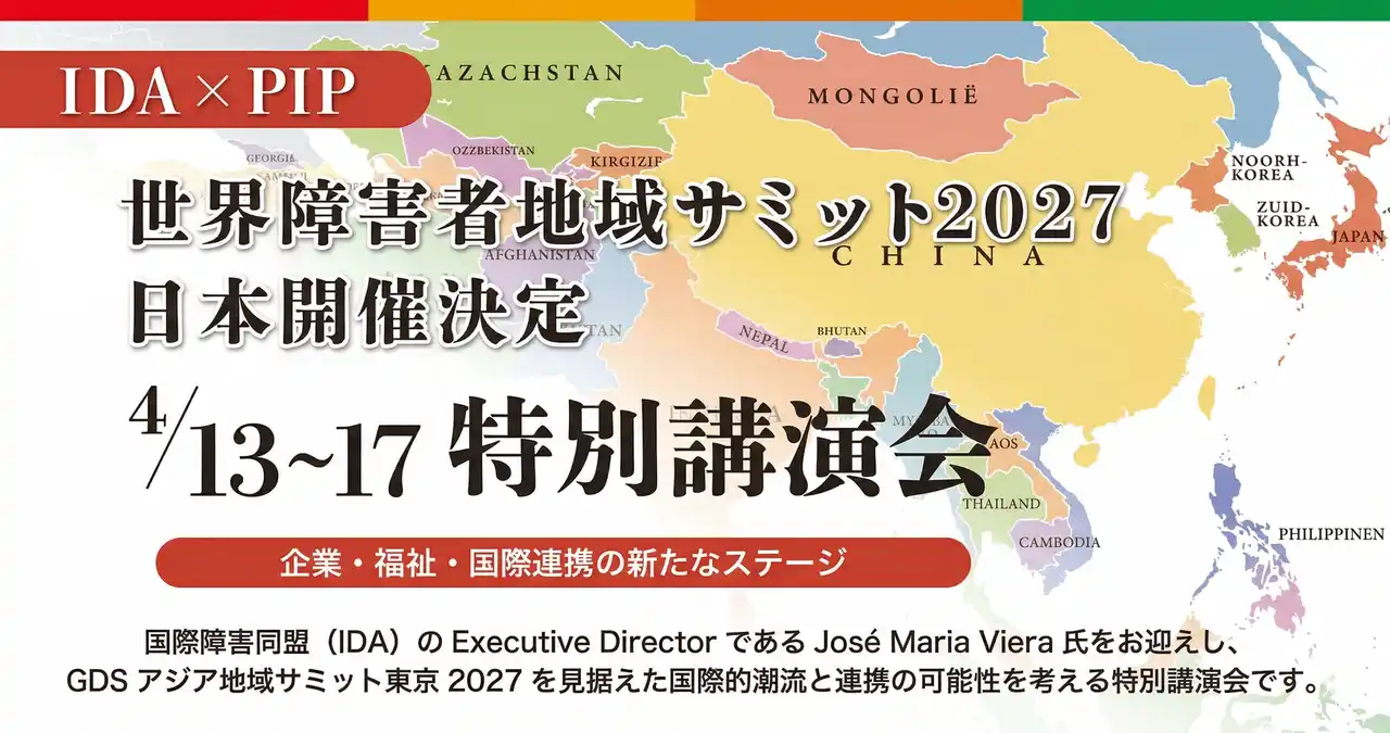 | 一般社団法人PEACE INCLUSION PIECE(代表理事:南北ちとせ、以下PIP)は、国際障害同盟(International Disability Alliance、以下IDA)との共催により、特別講演会「企業・福祉・国際連携の新たなステージ」を2025年4月13日(月)より東京・福岡・大阪の3都市で開催します。 | |||