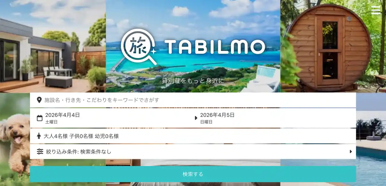 TABILMO(タビルモ)は、コテージ・貸別荘・民泊などの一棟貸し専門の予約サイトです。「ペット化」「サウナ付き」といった大手サイトでは埋もれがちな細かい条件検索のほか、複数家族や合宿などの大人数予約に強みを持ち、施設の個性を活かした集客が可能です。 |