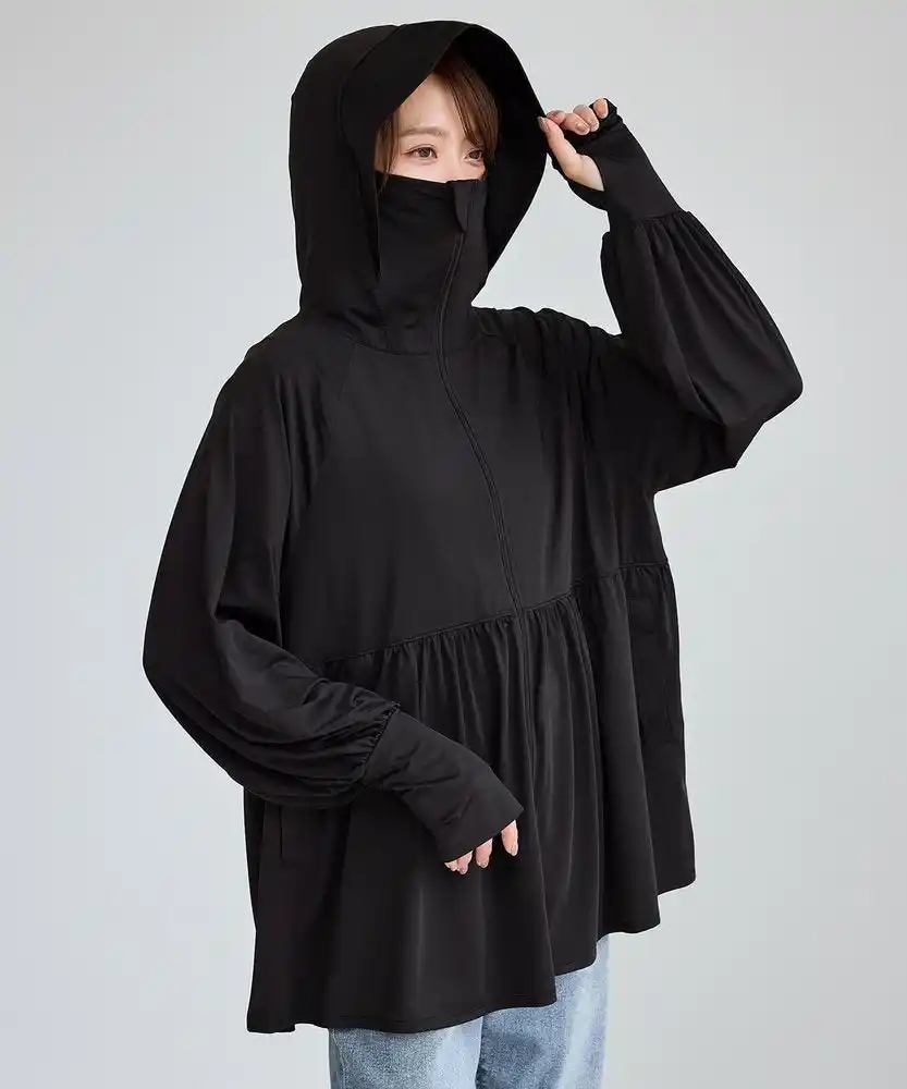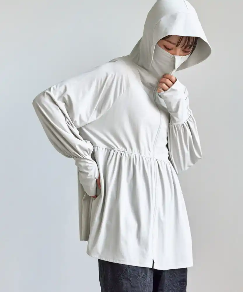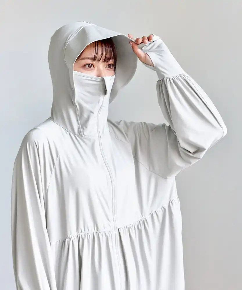 顔まわりから指先までしっかり肌を守ってくれるだけでなく、接触冷感機能を備えた素材を使用しているため、紫外線が気になる季節にも快適に着られる万能アイテムです。 つば付きのフードに加え、ファスナーを閉めることで鼻先まで覆うことができ、顔全体をしっかりカバーします。 |
