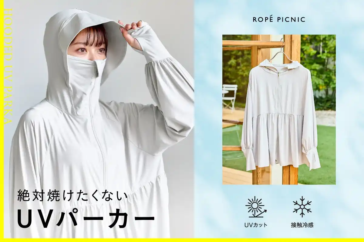 春先から紫外線指数がぐっと高まる季節に向け、日常からレジャーまでの幅広いシーンで活躍する商品を提案したいという想いから、機能性ファッションブランド「Yoki(ヨキ)」とロペピクニックがペプラムシルエットのUVパーカーを共同開発。機能性はカラー毎に異なるものの、ブラックはUVカット率99%以上、UPF50+と高い紫外線カットを備えています。「“絶対焼けたくない”日焼け対策シリーズ」の機能性はそのままに、「ROPE' PICNIC」ならではの“焼けたくない”と“かわいくいたい”を兼ね備えたデイリーユースしやすいUVパーカーです。 |