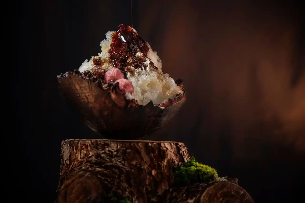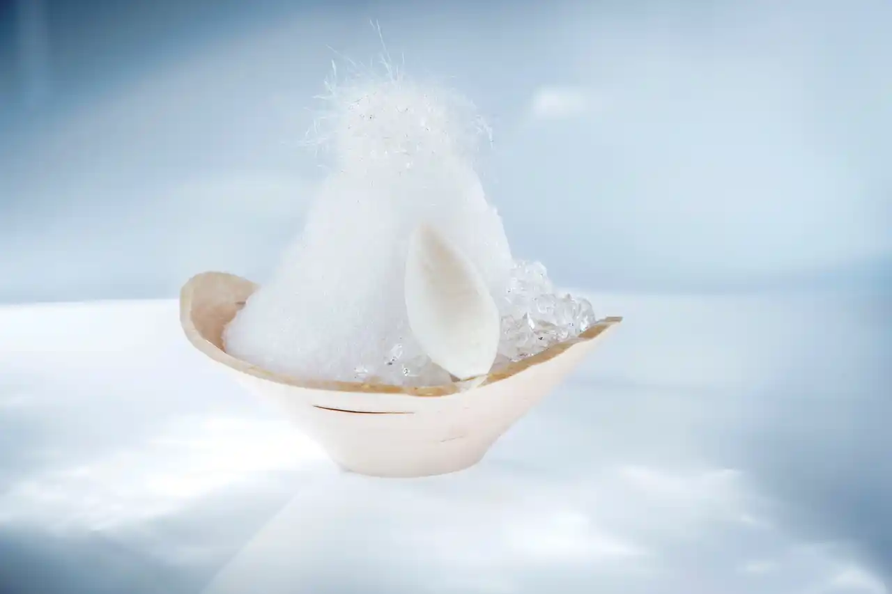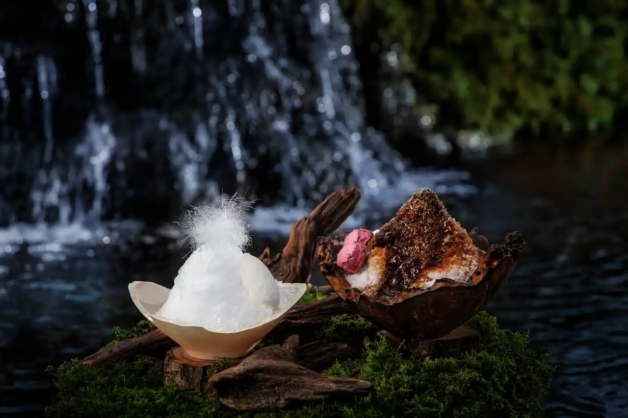 | 軽井沢に自生する白樺の凛とした姿に着想を得た一品です。使用するのは、雪解け時期の約一ヶ月間しか採取できないと言われる「白樺樹液」。透明感と森の息吹を感じるほのかな甘みが特徴です。 この樹液を用いた特製シロップに、艶やかな白樺ゼリーと、中には軽やかな口当たりのムースを忍ばせました。仕上げに添えるのは、白樺の樹液と枝葉を蒸留した白樺ジンの特製アイスクリーム。樹液の優しい甘みと、ジンの芳醇な香りが重なり、洗練された大人のかき氷です。 | |||||||||