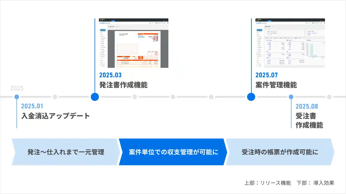 『ジョブカン見積/請求書』は、2022年4月5日のサービス提供開始より、請求書の作成・電子送付、入金データの連携機能で毎日の帳簿入力にかかる手間を削減し、請求業務のDXを支援してまいりました。現在はバックオフィス業務を少人数で担う中小企業を中心に、多くの企業にご利用いただいています。ご愛顧いただいている企業の皆さまの利便性向上のため、より使いやすいサービスとなるよう機能開発・追加を進めており、直近では2025年7月に案件ごとの帳票一元管理と進捗可視化を可能にする「案件管理機能」を、2026年3月にスムーズな海外取引を支援する「外貨帳票作成機能」をリリースするなど、サービスの拡充に努めています。 |