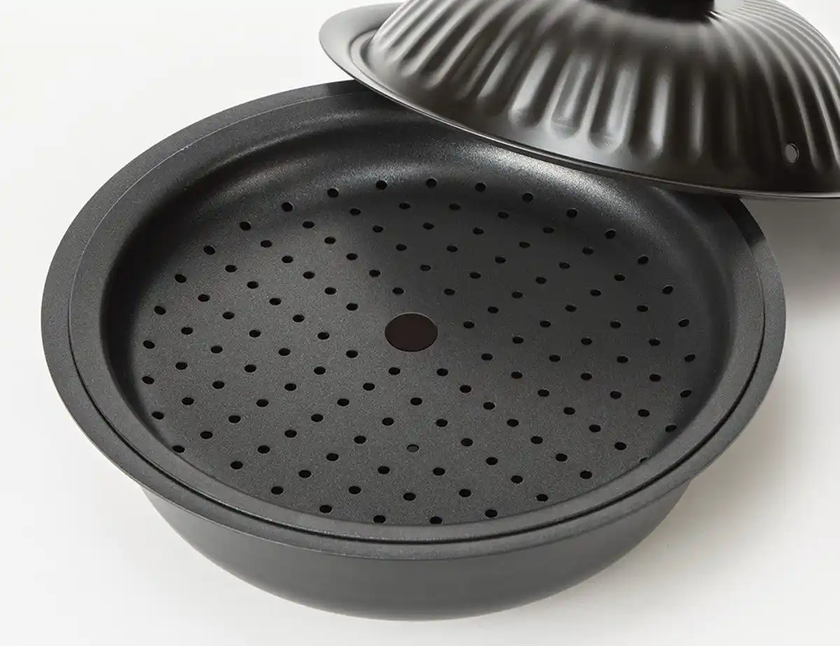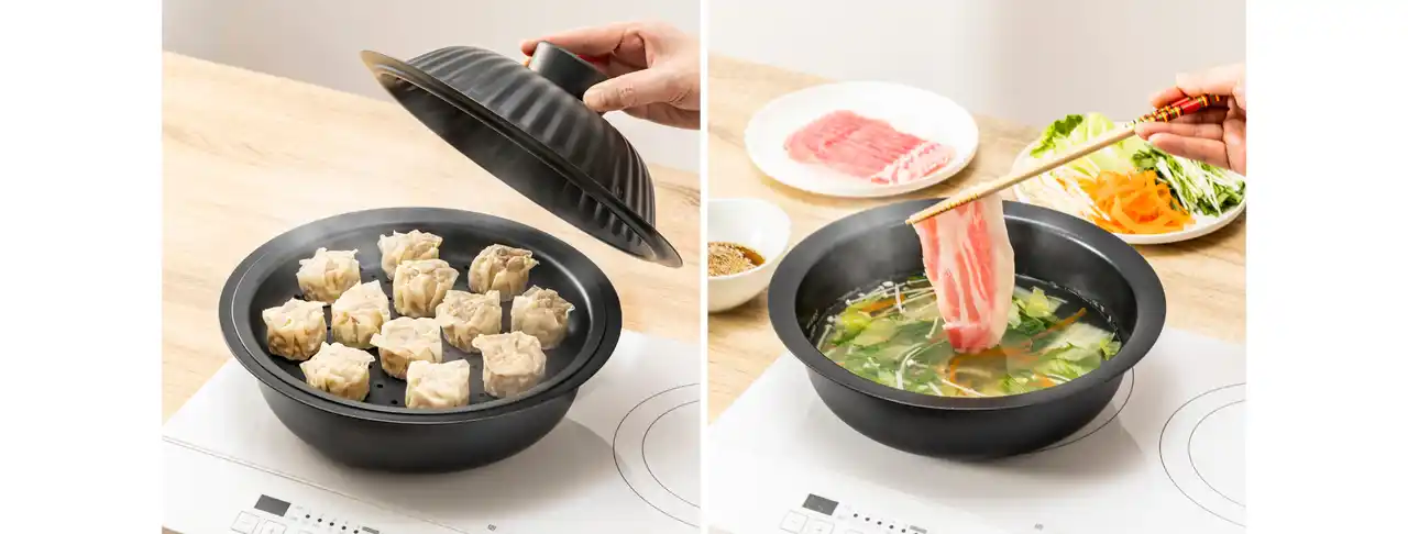 今回発売開始した「蒸し器付き卓上鍋」は、付属の蒸し器を使って蒸し調理もできる「卓上鍋」です。 |