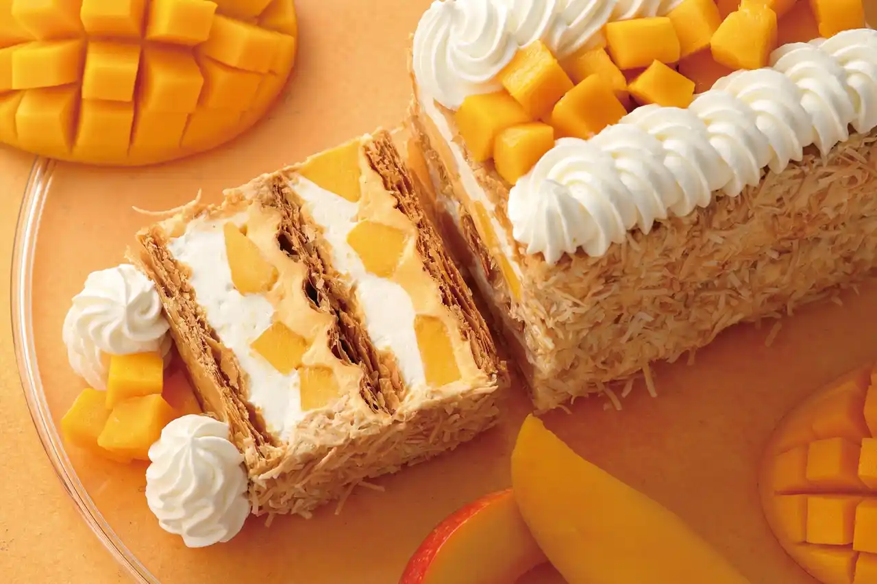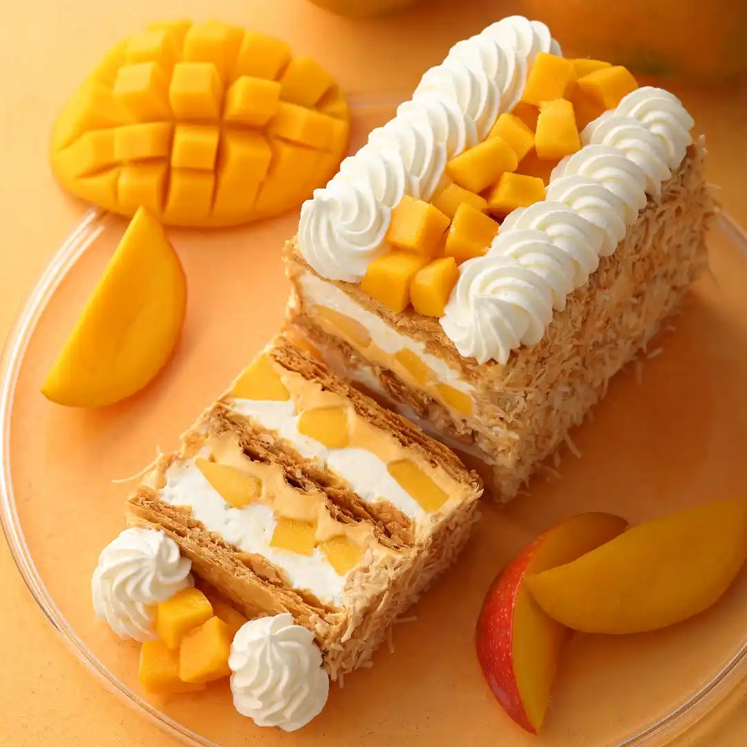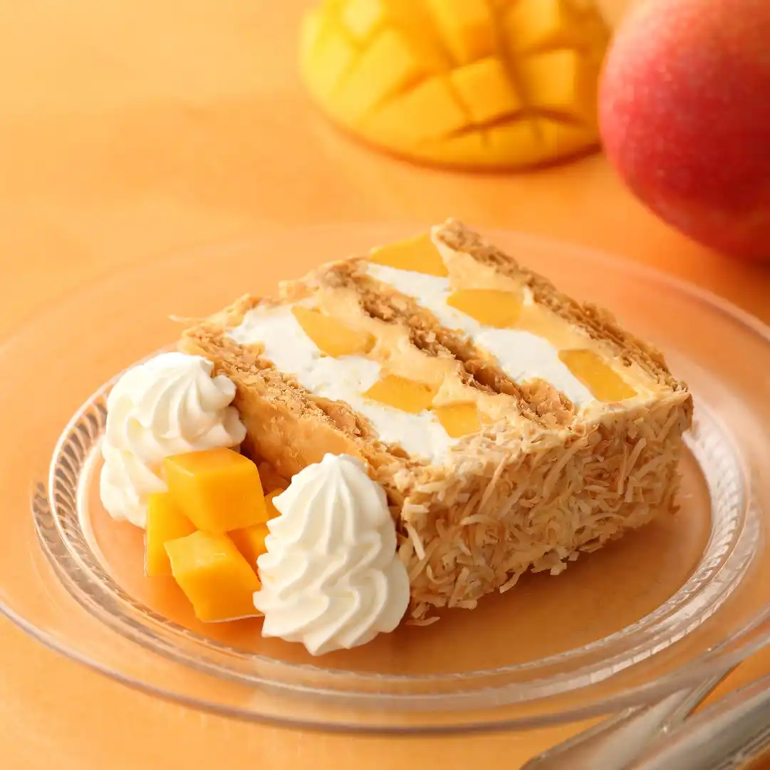 食欲そそる甘い香りと、樹上で完熟した宮崎産マンゴーの濃厚な果肉を、2種のクリームとサクサクのパイ生地でミルフィーユ仕立てにしました。 |