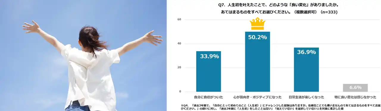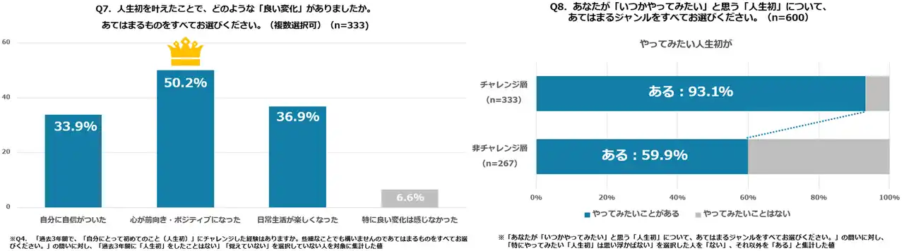 注目すべきは、挑戦がもたらす心身への好影響です。「人生初」に踏み出した人のうち、50.2%が「心が前向き・ポジティブになった」、36.9%が「日常生活が楽しくなった」と心身への影響を回答しています。 |