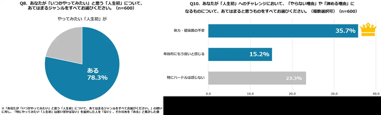 一方、挑戦を妨げるハードルを尋ねたところ、「体力・健康面の不安」が35.7%で最多となりました。また、「年齢的にもう遅い」(15.2%)も多く回答として挙げられ、体力と年齢を理由に人生初を断念する人が多くいました。 |