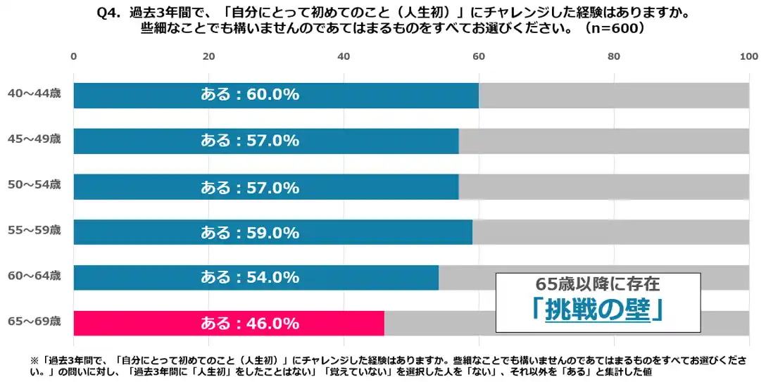 年代別に見ると、「人生初」への挑戦経験率は40代前半で60%と最も高く、50代でも57~59%と高水準を維持しています。しかし、65歳以降になると46%まで低下、50代後半と比較して13ポイントもの差が生じており「挑戦の壁」が生じていることがわかりました。この急激な数値の落ち込みの背景には、先述の「体力・健康面の不安」(35.7%)や「年齢的にもう遅い」(15.2%)といった心理的・身体的ハードルが加齢によって大きく影響している可能性が示唆されました。 |